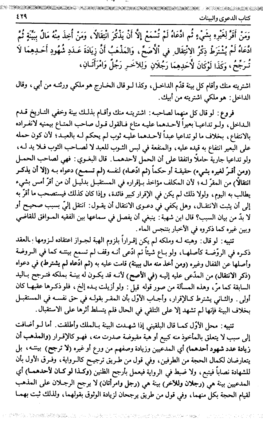 تَنْبِيهٌ مَحِلُّ الْأَوَّلِ كَمَا قَالَ الْبُلْقِينِيُّ إذَا شَهِدَتْ الْبَيِّنَةُ بِالْمِلْكِ وَأُطْلِقَتْ. أَمَّا لَوْ أَضَافَتْ إلَى سَبَبٍ لَا يَتَعَلَّقُ بِالْمَأْخُوذِ مِنْهُ كَبَيْعٍ أَوْ هِبَةٍ مَقْبُوضَةٍ صَدَرَتْ مِنْهُ، فَهُوَ كَالْإِقْرَارِ (وَالْمَذْهَبُ أَنَّ زِيَادَةَ عَدَدِ شُهُودِ أَحَدِهِمَا) أَيْ الْمُدَّعِيَيْنِ وَزِيَادَةَ وَصْفِهِمْ مِنْ وَرَعٍ أَوْ غَيْرِهِ (لَا تُرَجِّحُ) بَيِّنَتَهُ، بَلْ يَتَعَارَضَانِ لِكَمَالِ الْحُجَّةِ مِنْ الطَّرَفَيْنِ، وَفِي قَوْلٍ مِنْ طَرِيقِ تَرْجِيحٍ كَالرِّوَايَةِ، وَفُرِّقَ الْأَوَّلُ بِأَنَّ لِلشَّهَادَةِ نِصَابًا فَيُتَّبَعُ، وَلَا ضَبْطَ فِي الرِّوَايَةِ فَيُعْمَلُ بِأَرْجَحِ الظَّنَّيْنِ (وَكَذَا لَوْ) (كَانَ لِأَحَدِهِمَا) أَيْ الْمُدَّعِيَيْنِ بَيِّنَةٌ هِيَ (رَجُلَانِ وَلِلْآخَرِ) بَيِّنَةٌ هِيَ (رَجُلٌ وَامْرَأَتَانِ) لَا يُرَجَّحُ الرَّجُلَانِ عَلَى الْمَذْهَبِ لِقِيَامِ الْحُجَّةِ بِكُلٍّ مِنْهُمَا، وَفِي قَوْلٍ مِنْ طَرِيقٍ يُرَجَّحَانِ لِزِيَادَةِ الْوُثُوقِ بِقَوْلِهِمَا، وَلِذَلِكَ ثَبَتَ بِهِمَا