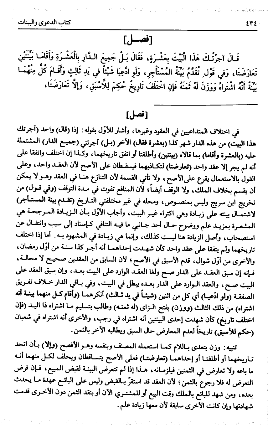 فصل قَالَ آجَرْتُك هَذَا الْبَيْتَ بِعَشْرَةٍ، فَقَالَ بَلْ جَمِيعَ الدَّارِ بِالْعَشَرَةِ وَأَقَامَا بَيِّنَتَيْنِ تَعَارَضَتَا، وَفِي قَوْلٍ تُقَدَّمُ بَيِّنَةُ الْمُسْتَأْجِرِ.