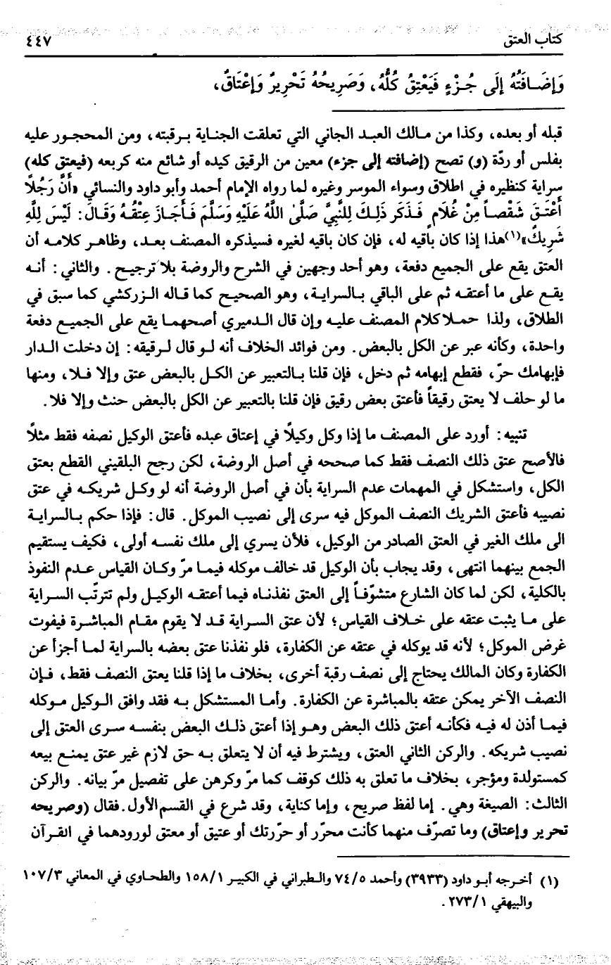 ـــــــــــــــــــــــــــــQقَبْلَهُ أَوْ بَعْدَهُ، وَكَذَا مِنْ مَالِكِ الْعَبْدِ الْجَانِي الَّتِي تَعَلَّقَتْ الْجِنَايَةُ بِرَقَبَتِهِ، وَمِنْ الْمَحْجُورِ عَلَيْهِ بِفَلَسٍ أَوْ رِدَّةٍ (وَ) تَصِحُّ (إضَافَتُهُ إلَى جُزْءٍ) مُعَيَّنٍ مِنْ الرَّقِيقِ كَيَدِهِ أَوْ شَائِعٍ مِنْهُ كَرُبُعِهِ (فَيَعْتِقُ كُلُّهُ) سِرَايَةً كَنَظِيرِهِ فِي إطْلَاقٍ وَسَوَاءٌ الْمُوسِرُ وَغَيْرُهُ لِمَا رَوَاهُ الْإِمَامُ أَحْمَدُ وَأَبُو دَاوُد وَالنَّسَائِيُّ «أَنَّ رَجُلًا أَعْتَقَ شِقْصًا مِنْ غُلَامٍ فَذَكَرَ ذَلِكَ لِلنَّبِيِّ - صَلَّى اللَّهُ عَلَيْهِ وَسَلَّمَ - فَأَجَازَ عِتْقَهُ وَقَالَ: لَيْسَ لِلَّهِ شَرِيكٌ» هَذَا إذَا كَانَ بَاقِيهِ لَهُ. فَإِنْ كَانَ بَاقِيهِ لِغَيْرِهِ فَسَيَذْكُرُهُ الْمُصَنِّفُ بَعْدُ، وَظَاهِرُ كَلَامِهِ أَنَّ الْعِتْقَ يَقَعُ عَلَى الْجَمِيعِ دَفْعَةً، وَهُوَ أَحَدُ وَجْهَيْنِ فِي الشَّرْحِ وَالرَّوْضَةِ بِلَا تَرْجِيحٍ. وَالثَّانِي: أَنَّهُ يَقَعُ عَلَى مَا أَعْتَقَهُ ثُمَّ عَلَى الْبَاقِي بِالسِّرَايَةِ، وَهُوَ الصَّحِيحُ كَمَا قَالَهُ الزَّرْكَشِيُّ كَمَا سَبَقَ فِي الطَّلَاقِ، وَلِذَا حَمَلَا كَلَامَ الْمُصَنِّفِ عَلَيْهِ وَإِنْ قَالَ الدَّمِيرِيُّ أَصَحُّهُمَا يَقَعُ عَلَى الْجَمِيعِ دَفْعَةً وَاحِدَةً، وَكَأَنَّهُ عَبَّرَ عَنْ الْكُلِّ بِالْبَعْضِ. وَمِنْ فَوَائِدِ الْخِلَافِ أَنَّهُ لَوْ قَالَ لِرَقِيقِهِ: إنْ دَخَلْت الدَّارَ فَإِبْهَامُكِ حُرٌّ، فَقَطَعَ إبْهَامَهُ ثُمَّ دَخَلَ، فَإِنْ قُلْنَا بِالتَّعْبِيرِ عَنْ الْكُلِّ بِالْبَعْضِ عَتَقَ وَإِلَّا فَلَا، وَمِنْهَا مَا لَوْ حَلَفَ لَا يُعْتِقُ رَقِيقًا فَأَعْتَقَ بَعْضَ رَقِيقٍ فَإِنْ قُلْنَا بِالتَّعْبِيرِ عَنْ الْكُلِّ بِالْبَعْضِ حَنِثَ وَإِلَّا فَلَا.