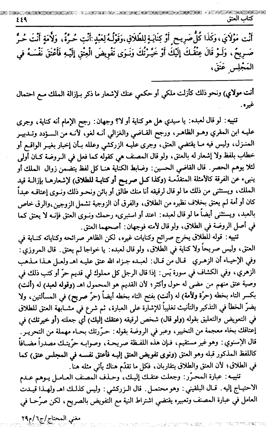 ـــــــــــــــــــــــــــــQأَنْتَ مَوْلَايَ) وَنَحْوُ ذَلِكَ كَأَزَلْت مِلْكِي أَوْ حُكْمِي عَنْكَ لِإِشْعَارِ مَا ذُكِرَ بِإِزَالَةِ الْمِلْكِ مَعَ احْتِمَالِ غَيْرِهِ.
