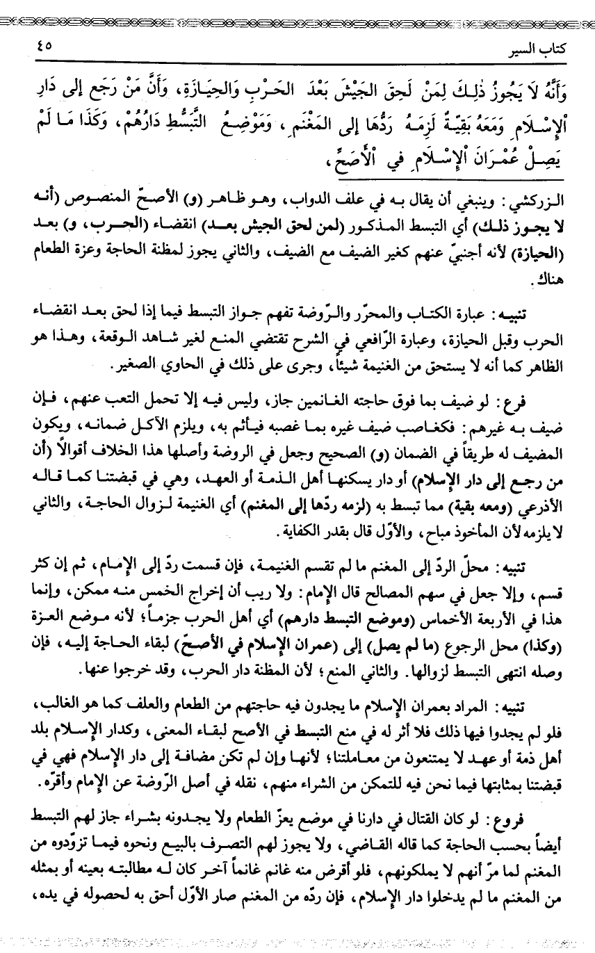 تَنْبِيهٌ: الْمُرَادُ بِعِمْرَانِ الْإِسْلَامِ مَا يَجِدُونَ فِيهِ حَاجَتَهُمْ مِنْ الطَّعَامِ وَالْعَلَفِ كَمَا هُوَ الْغَالِبُ، فَلَوْ لَمْ يَجِدُوا فِيهَا ذَلِكَ فَلَا أَثَرَ لَهُ فِي مَنْعِ التَّبَسُّطِ فِي الْأَصَحِّ لِبَقَاءِ الْمَعْنَى، وَكَدَارِ الْإِسْلَامِ بَلَد أَهْلِ ذِمَّةٍ أَوْ عَهْدٍ لَا يَمْتَنِعُونَ مِنْ مُعَامَلَتِنَا؛ لِأَنَّهَا وَإِنْ لَمْ تَكُنْ مُضَافَةً إلَى دَارِ الْإِسْلَامِ فَهِيَ فِي قَبْضَتِنَا بِمَثَابَتِهَا فِيمَا نَحْنُ فِيهِ لِلتَّمَكُّنِ مِنْ الشِّرَاءِ مِنْهُمْ، نَقَلَهُ فِي أَصْلِ الرَّوْضَةِ عَنْ الْإِمَامِ وَأَقَرَّهُ.