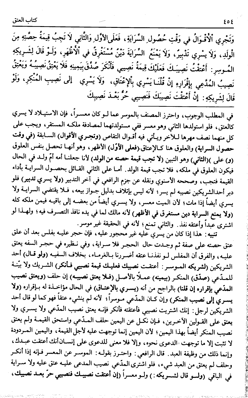 (وَلَوْ) (قَالَ) أَحَدُ الشَّرِيكَيْنِ (لِشَرِيكِهِ الْمُوسِرِ: أَعْتَقْت نَصِيبَك فَعَلَيْك قِيمَةُ نَصِيبِي فَأَنْكَرَ) الشَّرِيكُ وَلَا بَيِّنَةَ لِلْمُدَّعِي (صُدِّقَ) الْمُنْكِرُ (بِيَمِينِهِ) عَمَلًا بِالْأَصْلِ (فَلَا يَعْتِقُ نَصِيبُهُ) إنْ حَلَفَ (وَيَعْتِقُ نَصِيبُ الْمُدَّعِي بِإِقْرَارِهِ إنْ قُلْنَا) بِالرَّاجِحِ مِنْ أَنَّهُ (يَسْرِي بِالْإِعْتَاقِ) فِي الْحَالِ مُؤَاخَذَةً لَهُ بِإِقْرَارِهِ (وَلَا يَسْرِي إلَى نَصِيبِ الْمُنْكِرِ) وَإِنْ كَانَ الْمُدَّعِي مُوسِرًا؛ لِأَنَّهُ لَمْ يُنْشِئْ عِتْقًا فَهُوَ كَمَا لَوْ قَالَ أَحَدُ الشَّرِيكَيْنِ لِرَجُلٍ: إنَّك اشْتَرَيْتَ نَصِيبِي فَأَعْتَقْتَهُ فَأَنْكَرَ فَإِنَّهُ يَعْتِقُ نَصِيبَ الْمُدَّعِي وَلَا يَسْرِي وَلَا يَعْتِقُ عَلَى الْقَوْلَيْنِ الْآخَرَيْنِ، فَإِنْ نَكَلَ عَنْ الْيَمِينِ حَلَفَ الْمُدَّعِي وَاسْتَحَقَّ الْقِيمَةَ وَلَمْ يَعْتِقْ نَصِيبُ الْمُنْكِرِ أَيْضًا بِهَذَا الْيَمِينِ؛ لِأَنَّ الْيَمِينَ إنَّمَا تَوَجَّهَتْ عَلَيْهِ لِأَجْلِ الْقِيمَةِ، وَالْيَمِينُ الْمَرْدُودَةُ لَا تَثْبُتُ إلَّا مَا تَوَجَّهَتْ الدَّعْوَى نَحْوَهُ، وَإِلَّا فَلَا مَعْنَى لِلدَّعْوَى عَلَى إنْسَانٍ أَنَّكَ أَعْتَقْتَ عَبْدَكَ، وَإِنَّمَا ذَلِكَ مِنْ وَظِيفَةِ الْعَبْدِ. قَالَ الرَّافِعِيُّ: وَاحْتَرَزَ بِقَوْلِهِ: الْمُوسِرِ عَنْ الْمُعْسِرِ فَإِنَّهُ إذَا أَنْكَرَ وَحَلَفَ لَمْ يَعْتِقْ مِنْ الْعَبْدِ شَيْءٌ، فَلَوْ اشْتَرَى الْمُدَّعِي نَصِيبَ الْمُدَّعَى عَلَيْهِ عَتَقَ عَلَيْهِ وَلَا سِرَايَةَ فِي الْبَاقِي (وَلَوْ قَالَ لِشَرِيكِهِ:) وَلَوْ مُعْسِرًا (إنْ أَعْتَقْت نَصِيبَكَ فَنَصِيبِي حُرٌّ بَعْدَ نَصِيبِك،