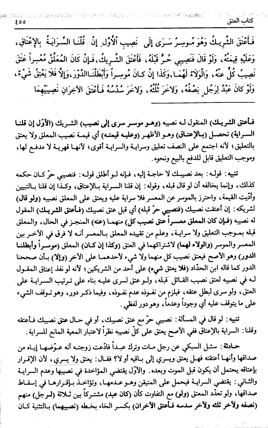 حَادِثَةٌ: سُئِلَ السُّبْكِيُّ عَنْ رَجُلٍ مَاتَ وَتَرَكَ عَبْدًا فَادَّعَتْ زَوْجَتُهُ أَنَّهُ عَوَّضَهَا إيَّاهُ مِنْ صَدَاقِهَا وَأَنَّهَا أَعْتَقَتْهُ فَهَلْ يَعْتِقُ وَيَسْرِي إلَى بَاقِيهِ أَوْ لَا؟ فَقَالَ: يَعْتِقُ وَلَا يَسْرِي؛ لِأَنَّ الْإِقْرَارَ بِإِعْتَاقِهِ يَحْتَمِلُ أَنْ يَكُونَ قَبْلَ الْمَوْتِ وَبَعْدَهُ. وَالْأَوَّلُ يَقْتَضِي الْمُؤَاخَذَةَ فِي نَصِيبِهَا وَعَدَمَ السِّرَايَةِ وَالثَّانِي: يَقْتَضِي السِّرَايَةَ فَيُحْمَلُ عَلَى الْمُتَيَقَّنِ وَهُوَ عَدَمُهَا، وَتُؤَاخَذُ بِإِقْرَارِهَا فِي إسْقَاطِ صَدَاقِهَا.