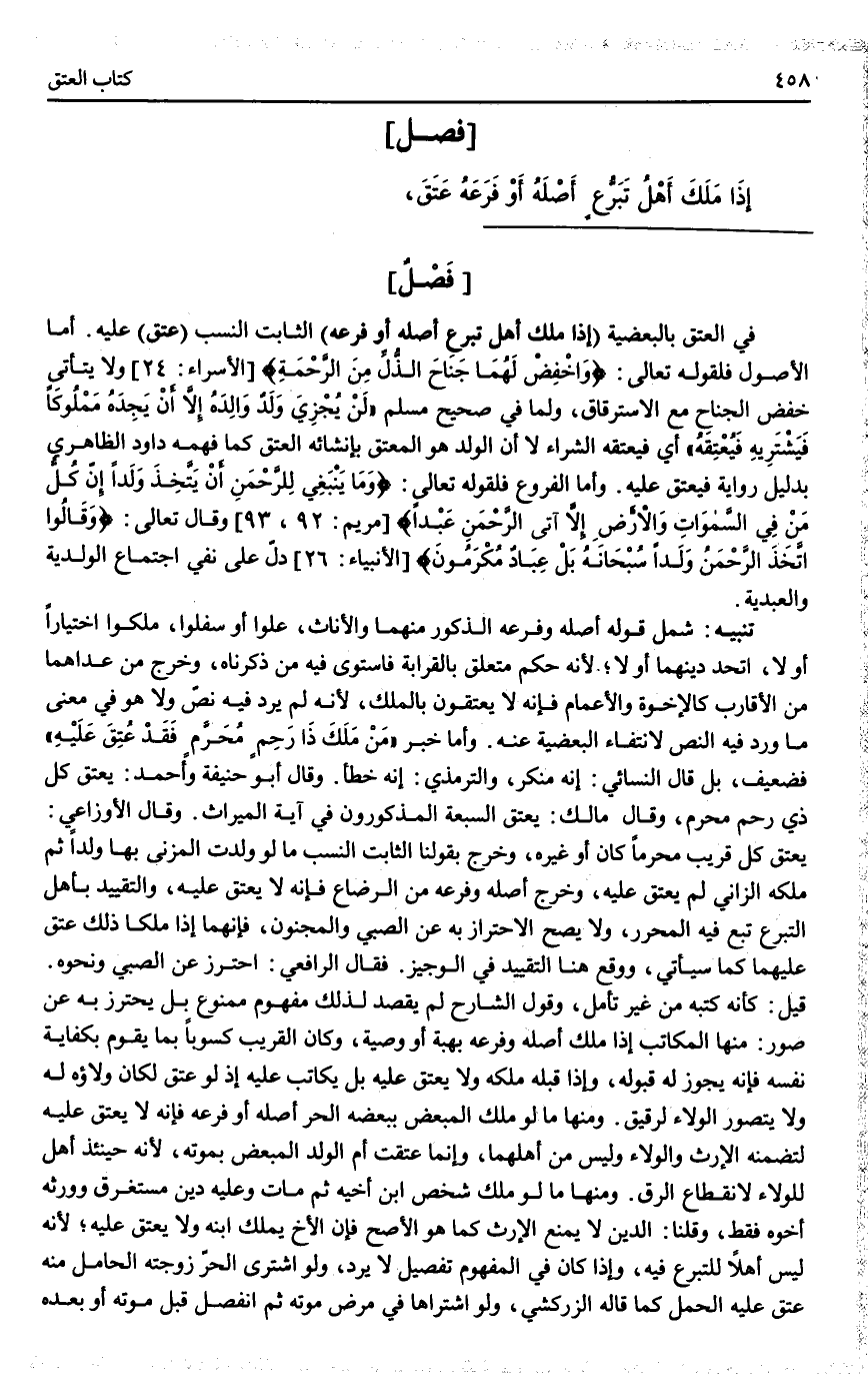 ِ (إذَا مَلَكَ أَهْلُ تَبَرُّعٍ أَصْلَهُ أَوْ فَرْعَهُ) الثَّابِتَ النَّسَبِ (عَتَقَ) عَلَيْهِ. أَمَّا الْأُصُولُ فَلِقَوْلِهِ تَعَالَى: {وَاخْفِضْ لَهُمَا جَنَاحَ الذُّلِّ مِنَ الرَّحْمَةِ} [الإسراء: 24] وَلَا يَتَأَتَّى خَفْضُ الْجَنَاحِ مَعَ الِاسْتِرْقَاقِ، وَلِمَا فِي صَحِيحِ مُسْلِمٍ «لَنْ يَجْزِيَ وَلَدٌ وَالِدَهُ إلَّا أَنْ يَجِدَهُ مَمْلُوكًا فَيَشْتَرِيَهُ فَيُعْتِقَهُ» أَيْ فَيُعْتِقَهُ الشِّرَاءُ لَا أَنَّ الْوَلَدَ هُوَ الْمُعْتِقُ بِإِنْشَائِهِ الْعِتْقَ كَمَا فَهِمَهُ دَاوُد الظَّاهِرِيُّ بِدَلِيلِ رِوَايَةِ فَيَعْتِقُ عَلَيْهِ. وَأَمَّا الْفُرُوعُ فَلِقَوْلِهِ تَعَالَى: {وَمَا يَنْبَغِي لِلرَّحْمَنِ أَنْ يَتَّخِذَ وَلَدًا} [مريم: 92] {إِنْ كُلُّ مَنْ فِي السَّمَاوَاتِ وَالأَرْضِ إِلا آتِي الرَّحْمَنِ عَبْدًا} [مريم: 93] وَقَالَ تَعَالَى: {وَقَالُوا اتَّخَذَ الرَّحْمَنُ وَلَدًا سُبْحَانَهُ بَلْ عِبَادٌ مُكْرَمُونَ} [الأنبياء: 26] دَلَّ عَلَى نَفْيِ اجْتِمَاعِ الْوَلَدِيَّةِ وَالْعَبْدِيَّةِ.