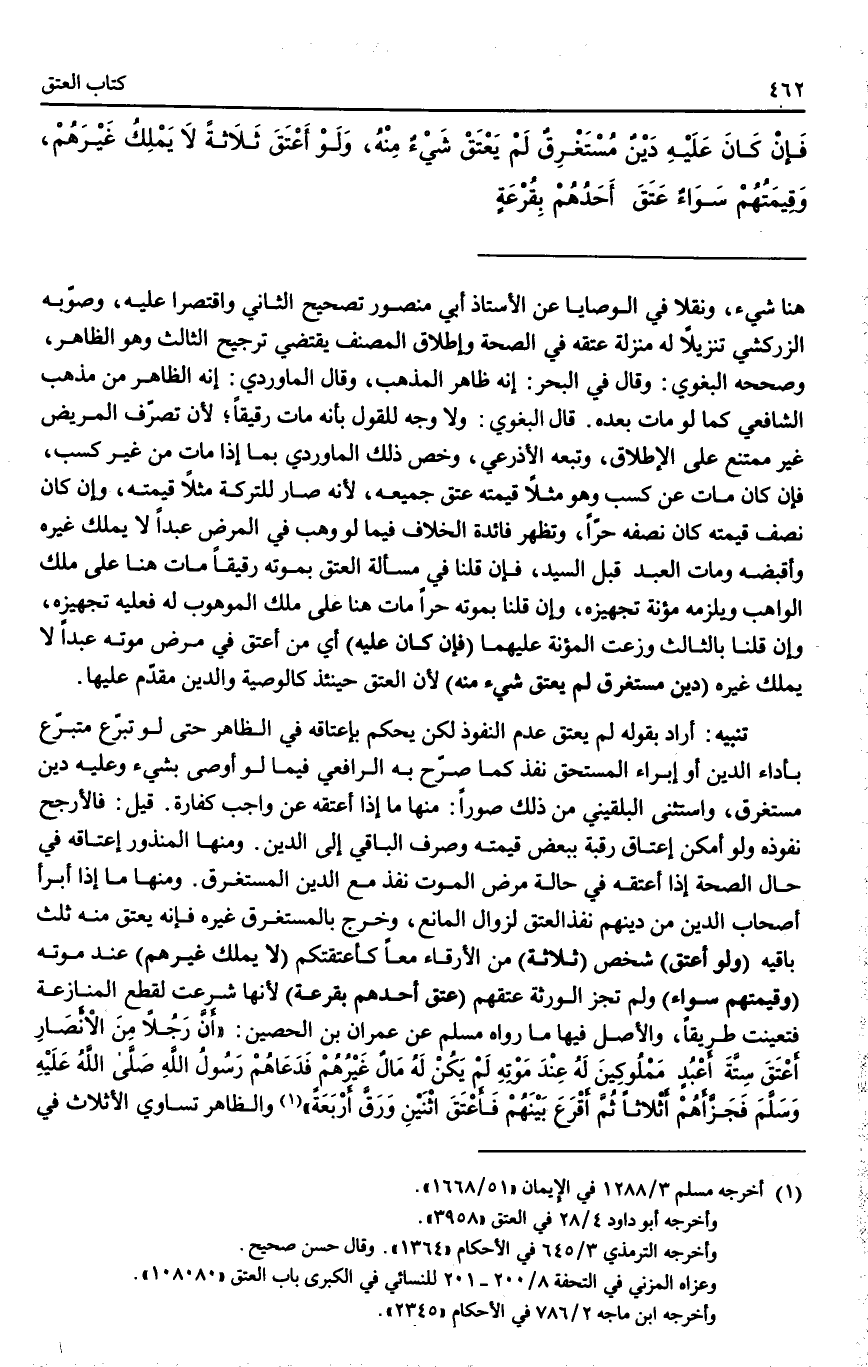 ـــــــــــــــــــــــــــــQهُنَا شَيْءٌ، وَنَقَلَا فِي الْوَصَايَا عَنْ الْأُسْتَاذِ أَبِي مَنْصُورٍ تَصْحِيحَ الثَّانِي وَاقْتَصَرَا عَلَيْهِ، وَصَوَّبَهُ الزَّرْكَشِيُّ تَنْزِيلًا لَهُ مَنْزِلَةَ عِتْقِهِ فِي الصِّحَّةِ، وَإِطْلَاقُ الْمُصَنِّفِ يَقْتَضِي تَرْجِيحَ الثَّالِثِ وَهُوَ الظَّاهِرُ، وَصَحَّحَهُ الْبَغَوِيّ: وَقَالَ فِي الْبَحْرِ: إنَّهُ ظَاهِرُ الْمَذْهَبِ، وَقَالَ الْمَاوَرْدِيُّ: إنَّهُ الظَّاهِرُ مِنْ مَذْهَبِ الشَّافِعِيِّ كَمَا لَوْ مَاتَ بَعْدَهُ. قَالَ الْبَغَوِيّ: وَلَا وَجْهَ لِلْقَوْلِ بِأَنَّهُ مَاتَ رَقِيقًا؛ لِأَنَّ تَصَرُّفَ الْمَرِيضِ غَيْرُ مُمْتَنِعٍ عَلَى الْإِطْلَاقِ، وَتَبِعَهُ الْأَذْرَعِيُّ، وَخَصَّ ذَلِكَ الْمَاوَرْدِيُّ بِمَا إذَا مَاتَ مِنْ غَيْرِ كَسْبٍ، فَإِنْ كَانَ مَاتَ عَنْ كَسْبٍ وَهُوَ مَثَلًا قِيمَتُهُ عَتَقَ جَمِيعُهُ؛ لِأَنَّهُ صَارَ لِلتَّرِكَةِ مَثَلًا قِيمَتُهُ، وَإِنْ كَانَ نِصْفُ قِيمَتِهِ كَانَ نِصْفُهُ حُرًّا، وَتَظْهَرُ فَائِدَةُ الْخِلَافِ فِيمَا لَوْ وَهَبَ فِي الْمَرَضِ عَبْدًا لَا يَمْلِكُ غَيْرَهُ وَأَقْبَضَهُ وَمَاتَ الْعَبْدُ قَبْلَ السَّيِّدِ، فَإِنْ قُلْنَا فِي مَسْأَلَةِ الْعِتْقِ بِمَوْتِهِ رَقِيقًا مَاتَ هُنَا عَلَى مِلْكِ الْوَاهِبِ وَيَلْزَمُهُ مُؤْنَةُ تَجْهِيزِهِ، وَإِنْ قُلْنَا بِمَوْتِهِ حُرًّا مَاتَ هُنَا عَلَى مِلْكِ الْمَوْهُوبِ لَهُ فَعَلَيْهِ تَجْهِيزُهُ، وَإِنْ قُلْنَا بِالثَّالِثِ وُزِّعَتْ الْمُؤْنَةُ عَلَيْهِمَا (فَإِنْ) (كَانَ عَلَيْهِ) أَيْ مَنْ أَعْتَقَ فِي مَرَضِ مَوْتِهِ عَبْدًا لَا يَمْلِكُ غَيْرَهُ (دَيْنٌ مُسْتَغْرِقٌ) (لَمْ يَعْتِقْ شَيْءٌ مِنْهُ) ؛ لِأَنَّ الْعِتْقَ حِينَئِذٍ كَالْوَصِيَّةِ وَالدَّيْنُ مُقَدَّمٌ عَلَيْهَا.