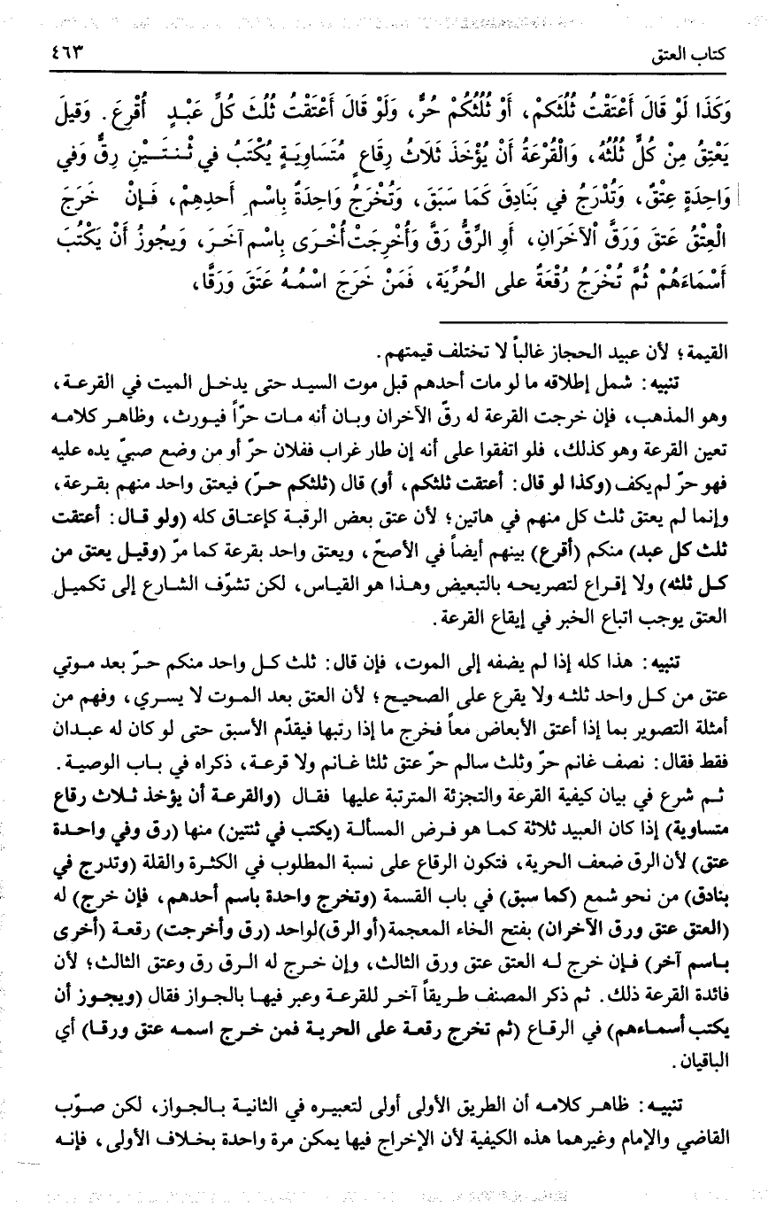 وَالْقُرْعَةُ أَنْ يُؤْخَذَ ثَلَاثُ رِقَاعٍ مُتَسَاوِيَةٌ يُكْتَبُ فِي ثِنْتَيْنِ رِقٌّ وَفِي وَاحِدَةٍ عِتْقٌ، وَتُدْرَجُ فِي بَنَادِقَ كَمَا سَبَقَ، وَتَخْرُجُ وَاحِدَةٌ بِاسْمِ أَحَدِهِمْ، فَإِنْ خَرَجَ الْعِتْقُ عَتَقَ وَرَقَّ الْآخَرَانِ، أَوْ الرِّقُّ رَقَّ وَأُخْرِجَتْ أُخْرَى بِاسْمٍ آخَرَ، يَجُوزُ أَنْ يَكْتُبَ أَسْمَاءَهُمْ ثُمَّ تُخْرَجُ رُقْعَةٌ عَلَى الْحُرِّيَّةِ، فَمَنْ خَرَجَ اسْمُهُ عَتَقَ وَرَقَّا،