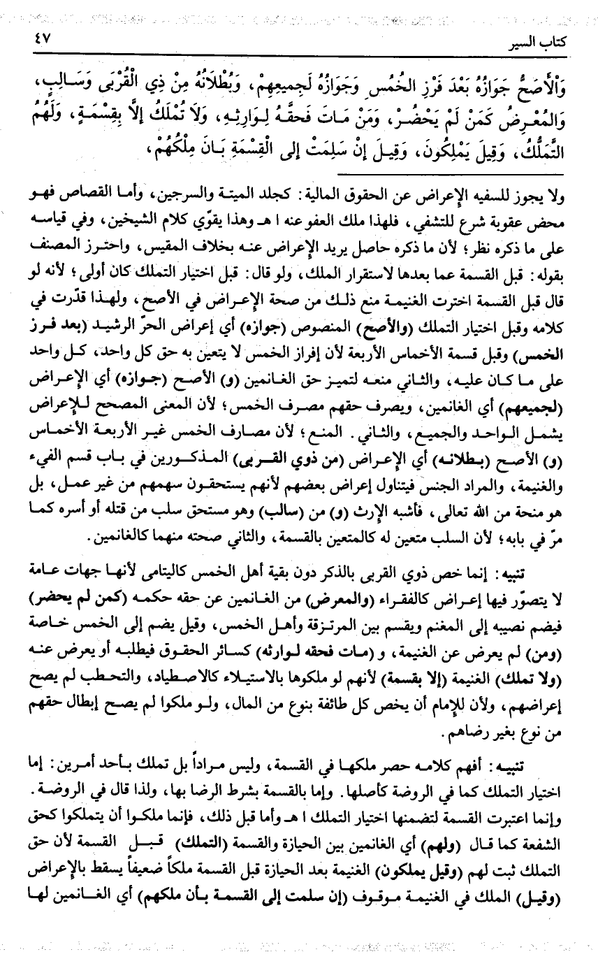(وَالْمُعْرِضُ) مِنْ الْغَانِمِينَ عَنْ حَقِّهِ حُكْمُهُ (كَمَنْ لَمْ يَحْضُرْ) فَيَضُمُّ نَصِيبَهُ إلَى الْمَغْنَمِ وَيُقَسَّمُ بَيْنَ الْمُرْتَزَقَةِ وَأَهْلِ الْخُمْسِ، وَقِيلَ يَضُمُّ إلَى الْخُمْسِ خَاصَّةً (وَمَنْ) لَمْ يُعْرِضْ عَنْ الْغَنِيمَةِ، وَ (مَاتَ فَحَقُّهُ لِوَارِثِهِ) كَسَائِرِ الْحُقُوقِ فَيَطْلُبُهُ أَوْ يُعْرِضُ عَنْهُ (وَلَا تُمْلَكُ) الْغَنِيمَةُ (إلَّا بِقِسْمَةٍ) ؛ لِأَنَّهُمْ لَوْ مَلَكُوهَا بِالِاسْتِيلَاءِ كَالِاصْطِيَادِ، وَالتَّحَطُّبِ لَمْ يَصِحَّ إعْرَاضُهُمْ، وَلِأَنَّ لِلْإِمَامِ أَنْ يَخُصَّ كُلَّ طَائِفَةٍ بِنَوْعٍ مِنْ الْمَالِ، وَلَوْ مَلَكُوا لَمْ يَصِحَّ إبْطَالُ حَقِّهِمْ مِنْ نَوْعٍ بِغَيْرِ رِضَاهُمْ.
