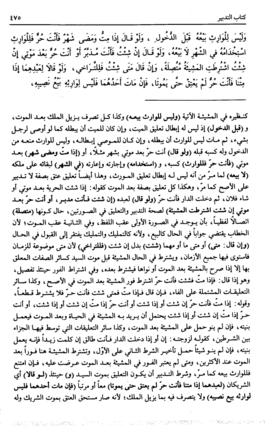 ـــــــــــــــــــــــــــــQكَنَظِيرِهِ فِي الْمَشِيئَةِ الْآتِيَةِ (وَلَيْسَ لِلْوَارِثِ بَيْعُهُ) وَكَذَا كُلُّ تَصَرُّفٍ يُزِيلُ الْمِلْكَ بَعْدَ الْمَوْتِ، وَ (قَبْلَ الدُّخُولِ) إذْ لَيْسَ لَهُ إبْطَالُ تَعْلِيقِ الْمَيِّتِ، وَإِنْ كَانَ لِلْمَيِّتِ أَنْ يُبْطِلَهُ كَمَا لَوْ أَوْصَى لِرَجُلٍ بِشَيْءٍ، ثُمَّ مَاتَ لَيْسَ لِلْوَارِثِ أَنْ يُبْطِلَهُ، وَإِنْ كَانَ لِلْمُوصِي إبْطَالُهُ، وَلَيْسَ لِلْوَارِثِ مَنْعُهُ مِنْ الدُّخُولِ وَلَهُ كَسْبُهُ قَبْلَهُ (وَلَوْ قَالَ) أَنْتَ حُرٌّ بَعْدَ مَوْتِي بِشَهْرٍ مَثَلًا، أَوْ (إذَا مِتُّ وَمَضَى شَهْرٌ) بَعْدَ مَوْتِي (فَأَنْتَ حُرٌّ فَلِلْوَارِثِ) كَسْبُهُ، وَ (اسْتِخْدَامُهُ) وَإِجَارَتُهُ وَإِعَارَتُهُ (فِي الشَّهْرِ) لِبَقَائِهِ عَلَى مِلْكِهِ (لَا بَيْعُهُ) لِمَا مَرَّ مِنْ أَنَّهُ لَيْسَ لَهُ إبْطَالُ تَعْلِيقِ الْمُوَرِّثِ، وَهَذَا أَيْضًا تَعْلِيقُ عِتْقٍ بِصِفَةٍ لَا تَدْبِيرٌ عَلَى الْأَصَحِّ كَمَا مَرَّ، وَهَكَذَا كُلُّ تَعْلِيقٍ بِصِفَةٍ بَعْدَ الْمَوْتِ كَقَوْلِهِ: إذَا شِئْتَ الْحُرِّيَّةَ بَعْدَ مَوْتِي أَوْ شَاءَ فُلَانٌ، ثُمَّ دَخَلْتَ الدَّارَ فَأَنْتَ حُرٌّ.