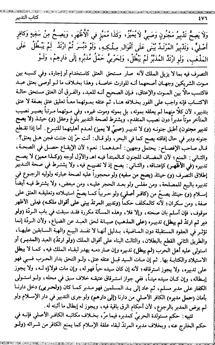 وَالْأَوَّلُ أَوْجَهُ (وَكَذَا مُمَيِّزٍ) لَا يَصِحُّ تَدْبِيرُهُ (فِي الْأَظْهَرِ) كَإِعْتَاقِهِ، وَالثَّانِي: يَصِحُّ إذْ لَا تَضْيِيعَ فِيهِ، وَلَا يُشْتَرَطُ فِي صِحَّةِ التَّدْبِيرِ إطْلَاقُ التَّصَرُّفِ (وَ) حِينَئِذٍ (يَصِحُّ مِنْ سَفِيهٍ) وَلَوْ مَحْجُورًا عَلَيْهِ لِصِحَّةِ عِبَارَتِهِ وَلِوَلِيِّهِ الرُّجُوعُ فِي تَدْبِيرِهِ بِالْبَيْعِ لِلْمَصْلَحَةِ، وَمِنْ مُفْلِسٍ وَلَوْ بَعْدَ الْحَجْرِ عَلَيْهِ، وَمِنْ مُبَعَّضٍ، وَلَا يُشْتَرَطُ فِيهِ أَيْضًا إسْلَامٌ (وَ) حِينَئِذٍ يَصِحُّ مِنْ (كَافِرٍ أَصْلِيٍّ) وَلَوْ حَرْبِيًّا كَمَا يَصِحُّ اسْتِيلَادُهُ وَتَعْلِيقُهُ الْعِتْقَ عَلَى صِفَةٍ، وَمِنْ سَكْرَانَ؛ لِأَنَّهُ كَالْمُكَلَّفِ حُكْمًا (وَتَدْبِيرُ الْمُرْتَدِّ يُبْنَى عَلَى أَقْوَالِ مِلْكِهِ) فَعَلَى الْأَظْهَرِ مَوْقُوفٌ، فَإِنْ أَسْلَمَ بَانَ صِحَّتُهُ، وَإِلَّا فَلَا، وَهَذِهِ الْمَسْأَلَةُ مُكَرَّرَةٌ فَقَدْ سَبَقَتْ فِي بَابِ الرِّدَّةِ.