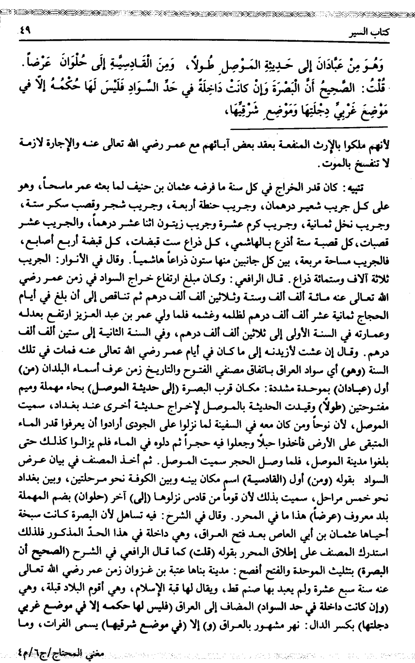 تَنْبِيهٌ: كَانَ قَدْرُ الْخَرَاجِ فِي كُلِّ سَنَةٍ مَا فَرَضَهُ عُثْمَانُ بْنُ حُنَيْفٍ لَمَّا بَعَثَهُ عُمَرُ مَاسِحًا، وَهُوَ عَلَى كُلِّ جَرِيبِ شَعِيرٍ دِرْهَمَانِ، وَجَرِيبِ حِنْطَةٍ أَرْبَعَةٌ، وَجَرِيبِ شَجَرٍ وَقَصَبِ سُكَّرٍ سِتَّةٌ، وَجَرِيبِ نَخْلٍ ثَمَانِيَةٌ، وَجَرِيبِ كَرْمٍ عَشْرَةٌ وَجَرِيبِ زَيْتُونٍ اثْنَا عَشَرَ دِرْهَمًا، وَالْجَرِيبُ عَشْرُ قَصَبَاتٍ، كُلُّ قَصَبَةٍ سِتَّةُ أَذْرُعٍ بِالْهَاشِمِيِّ، كُلُّ ذِرَاعٍ سِتُّ قَبَضَاتُ، كُلُّ قَبْضَةٍ أَرْبَعُ أَصَابِعَ، فَالْجَرِيبُ مَسَّاحَةٌ مُرَبِّعَةٌ، بَيْنَ كُلِّ جَانِبَيْنِ مِنْهَا سِتُّونَ ذِرَاعًا هَاشِمِيًّا. وَقَالَ: فِي الْأَنْوَارِ: الْجَرِيبُ ثَلَاثَةُ آلَافٍ وَسِتُّمِائَةِ ذِرَاعٍ. قَالَ: الرَّافِعِيُّ: وَكَانَ مَبْلَغُ ارْتِفَاعُ خَرَاجِ السَّوَادِ فِي زَمَنِ عُمَرَ - رَضِيَ اللَّهُ تَعَالَى عَنْهُ - مِائَةَ أَلْفِ أَلْفٍ وَسِتَّةً وَثَلَاثِينَ أَلْفِ أَلْفِ دِرْهَمٍ ثُمَّ تَنَاقَصَ إلَى أَنْ بَلَغَ فِي أَيَّامِ الْحَجَّاجِ ثَمَانِيَةَ عَشَرَ أَلْفِ أَلْفِ دِرْهَمٍ لِظُلْمِهِ وَغَشَمِه فَلَمَّا وُلِّيَ عُمَرُ بْنُ عَبْدِ الْعَزِيزِ ارْتَفَعَ بِعَدْلِهِ وَعِمَارَتِهِ فِي السَّنَةِ الْأُولَى إلَى ثَلَاثِينَ أَلْفِ أَلْفِ دِرْهَمٍ، وَفِي السَّنَةِ الثَّانِيَةِ إلَى سِتِّينَ أَلْفِ أَلْفِ دِرْهَمٍ. وَقَالَ: إنْ عِشْتُ لَأَزِيدَنَّهُ إلَى مَا كَانَ فِي أَيَّامِ عُمَرَ - رَضِيَ اللَّهُ تَعَالَى عَنْهُ - فَمَاتَ فِي تِلْكَ السَّنَةِ.