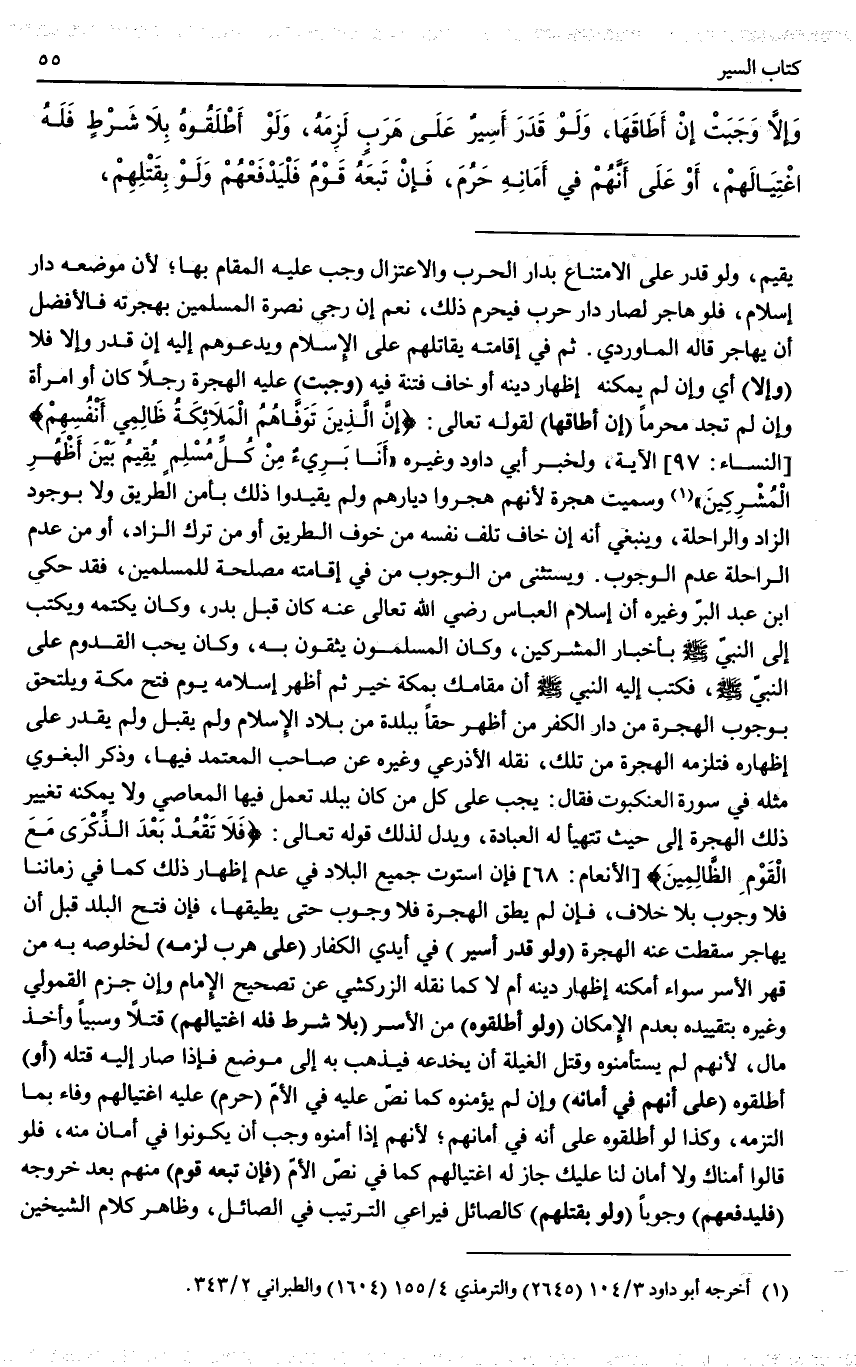 ـــــــــــــــــــــــــــــQيُقِيمَ، وَلَوْ قَدَرَ عَلَى الِامْتِنَاعِ بِدَارِ الْحَرْبِ وَالِاعْتِزَالِ وَجَبَ عَلَيْهِ الْمُقَامُ بِهَا؛ لِأَنَّ مَوْضِعَهُ دَارُ إسْلَامٍ، فَلَوْ هَاجَرَ لَصَارَ دَارَ حَرْبٍ فَيَحْرُمُ ذَلِكَ، نَعَمْ إنْ رَجَا نُصْرَةَ الْمُسْلِمِينَ بِهِجْرَتِهِ فَالْأَفْضَلُ أَنْ يُهَاجِرَ قَالَهُ الْمَاوَرْدِيُّ. ثُمَّ فِي إقَامَتِهِ يُقَاتِلُهُمْ عَلَى الْإِسْلَامِ وَيَدْعُوهُمْ إلَيْهِ إنْ قَدَرَ وَإِلَّا فَلَا (وَإِلَّا) أَيْ وَإِنْ لَمْ يُمْكِنْهُ إظْهَارُ دِينِهِ أَوْ خَافَ فِتْنَةً فِيهِ (وَجَبَتْ) عَلَيْهِ الْهِجْرَةُ رَجُلًا كَانَ أَوْ امْرَأَةً وَإِنْ لَمْ تَجِدْ مَحْرَمًا (إنْ أَطَاقَهَا) لِقَوْلِهِ تَعَالَى: {إِنَّ الَّذِينَ تَوَفَّاهُمُ الْمَلائِكَةُ ظَالِمِي أَنْفُسِهِمْ} [النساء: 97] الْآيَةَ، وَلِخَبَرِ أَبِي دَاوُد وَغَيْرِهِ «أَنَا بَرِيءٌ مِنْ كُلِّ مُسْلِمٍ يُقِيمُ بَيْنَ أَظْهُرِ الْمُشْرِكِينَ» وَسُمِّيَتْ هِجْرَةً؛ لِأَنَّهُمْ هَجَرُوا دِيَارَهُمْ وَلَمْ يُقَيِّدُوا ذَلِكَ بِأَمْنِ الطَّرِيقِ وَلَا بِوُجُودِ الزَّادِ وَالرَّاحِلَةِ، وَيَنْبَغِي أَنَّهُ إنْ خَافَ تَلَفَ نَفْسِهِ مِنْ خَوْفِ الطَّرِيقِ أَوْ مِنْ تَرْكِ الزَّادِ، أَوْ مِنْ عَدَمِ الرَّاحِلَةِ عُدِمَ الْوُجُوبُ. وَيُسْتَثْنَى مِنْ الْوُجُوبِ مَنْ فِي إقَامَتِهِ مَصْلَحَةٌ لِلْمُسْلِمِينَ، فَقَدْ حَكَى ابْنُ عَبْدِ الْبَرِّ وَغَيْرُهُ أَنَّ إسْلَامَ الْعَبَّاسِ - رَضِيَ اللَّهُ تَعَالَى عَنْهُ - كَانَ قَبْلَ بَدْرٍ، وَكَانَ يَكْتُمُهُ وَيَكْتُبُ إلَى النَّبِيِّ - صَلَّى اللَّهُ عَلَيْهِ وَسَلَّمَ - بِأَخْبَارِ الْمُشْرِكِينَ، وَكَانَ الْمُسْلِمُونَ يَثِقُونَ بِهِ، وَكَانَ يُحِبُّ الْقُدُومَ عَلَى النَّبِيِّ - صَلَّى اللَّهُ عَلَيْهِ وَسَلَّمَ - فَكَتَبَ إلَيْهِ النَّبِيُّ - صَلَّى اللَّهُ عَلَيْهِ وَسَلَّمَ - أَنَّ مُقَامَكَ بِمَكَّةَ خَيْرٌ ثُمَّ أَظْهَرَ إسْلَامَهُ يَوْمَ فَتْحِ مَكَّةَ وَيَلْتَحِقُ بِوُجُوبِ الْهِجْرَةِ مِنْ دَارِ الْكُفْرِ مَنْ أَظْهَرَ حَقًّا بِبَلْدَةٍ مِنْ بِلَادِ الْإِسْلَامِ وَلَمْ يَقْبَلْ وَلَمْ يَقْدِرْ عَلَى إظْهَارِهِ فَتَلْزَمُهُ الْهِجْرَةُ مِنْ تِلْكَ، نَقَلَهُ الْأَذْرَعِيُّ وَغَيْرُهُ عَنْ صَاحِبِ الْمُعْتَمَدِ فِيهَا، وَذَكَرَ الْبَغَوِيّ مِثْلَهُ فِي سُورَةِ الْعَنْكَبُوتِ فَقَالَ: يَجِبُ عَلَى كُلِّ مَنْ كَانَ بِبَلَدٍ تُعْمَلُ فِيهَا الْمَعَاصِي وَلَا يُمْكِنُهُ تَغْيِيرُ ذَلِكَ الْهِجْرَةُ إلَى حَيْثُ تَتَهَيَّأُ لَهُ الْعِبَادَةُ، وَيَدُلُّ لِذَلِكَ قَوْله تَعَالَى: {فَلا تَقْعُدْ بَعْدَ الذِّكْرَى مَعَ الْقَوْمِ الظَّالِمِينَ} [الأنعام: 68] فَإِنْ اسْتَوَتْ جَمِيعُ الْبِلَادُ فِي عَدَمِ إظْهَارِ ذَلِكَ كَمَا فِي زَمَانِنَا فَلَا وُجُوبَ بِلَا خِلَافٍ، فَإِنْ لَمْ يُطِقْ الْهِجْرَةَ فَلَا وُجُوبَ حَتَّى يُطِيقَهَا فَإِنْ فُتِحَ الْبَلَدُ قَبْلَ أَنْ يُهَاجِرَ سَقَطَتْ عَنْهُ الْهِجْرَةُ.