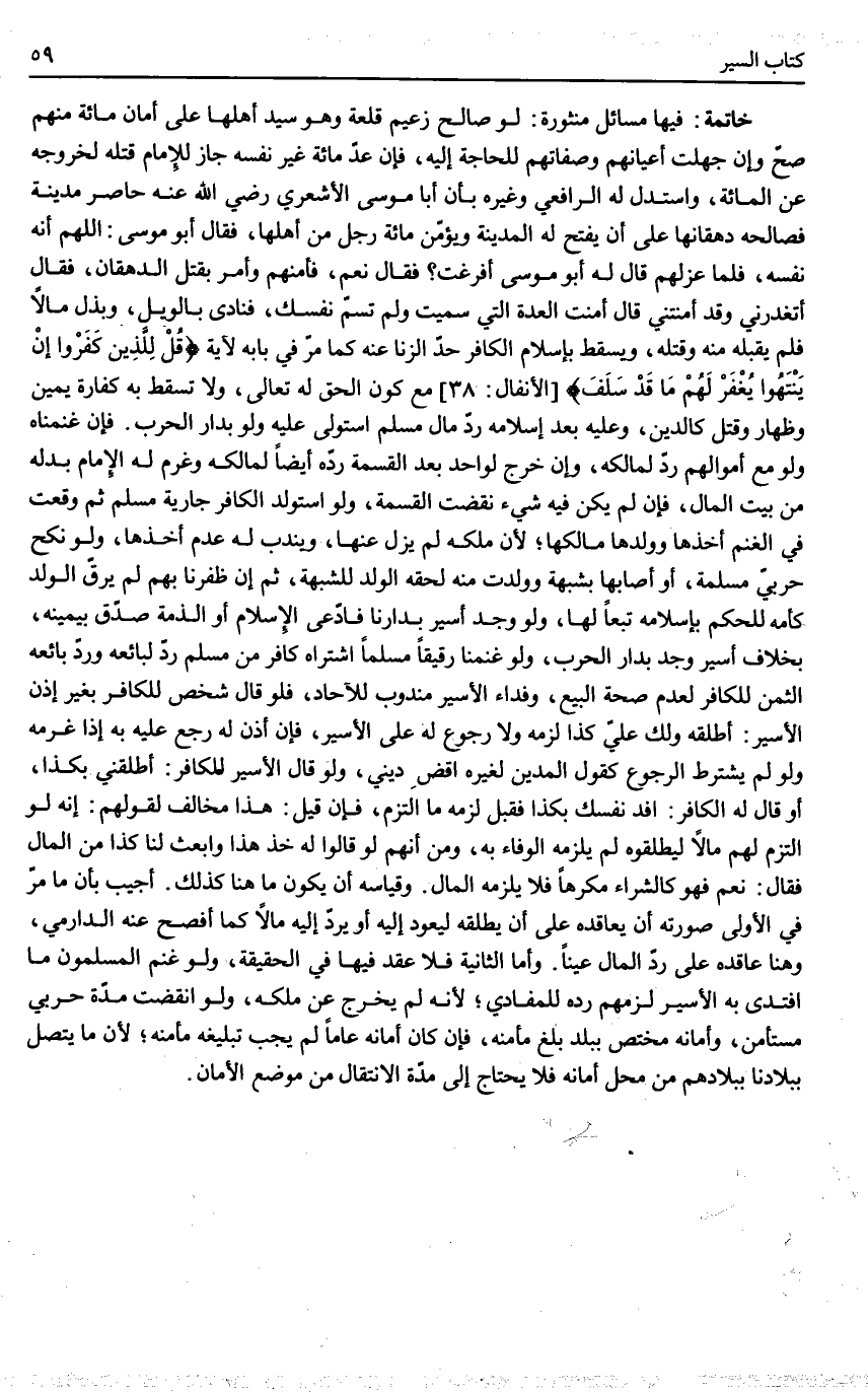 ـــــــــــــــــــــــــــــQخَاتِمَةٌ: فِيهَا مَسَائِلُ مَنْثُورَةٌ: لَوْ صَالَحَ زَعِيمُ قَلْعَةٍ وَهُوَ سَيِّدُ أَهْلِهَا عَلَى أَمَانِ مِائَةٍ مِنْهُمْ صَحَّ وَإِنْ جُهِلَتْ أَعْيَانُهُمْ وَصِفَاتُهُمْ لِلْحَاجَةِ إلَيْهِ، فَإِنْ عَدَّ مِائَةً غَيْرَ نَفْسِهِ جَازَ لِلْإِمَامِ قَتْلُهُ لِخُرُوجِهِ عَنْ الْمِائَةِ، وَاسْتَدَلَّ لَهُ الرَّافِعِيُّ وَغَيْرُهُ بِأَنَّ أَبَا مُوسَى الْأَشْعَرِيَّ - رَضِيَ اللَّهُ عَنْهُ - حَاصَرَ مَدِينَةً فَصَالَحَهُ دُهْقَانُهَا عَلَى أَنْ يَفْتَحَ لَهُ الْمَدِينَةَ وَيُؤَمِّنَ مِائَةَ رَجُلٍ مِنْ أَهْلِهَا، فَقَالَ: أَبُو مُوسَى: اللَّهُمَّ أَمِّنْهُ نَفْسَهُ، فَلَمَّا عَزَلَهُمْ قَالَ لَهُ أَبُو مُوسَى أَفَرَغْت؟ فَقَالَ: نَعَمْ، فَأَمَّنَهُمْ وَأَمَرَ بِقَتْلِ الدُّهْقَانِ، فَقَالَ: أَتَغْدِرُنِي وَقَدْ أَمَّنْتَنِي قَالَ: أَمَّنْتُ الْعِدَّةَ الَّتِي سَمَّيْتَ وَلَمْ تُسَمِّ نَفْسَكَ، فَنَادَى بِالْوَيْلِ، وَبَذَلَ مَالًا فَلَمْ يَقْبَلْهُ مِنْهُ وَقَتَلَهُ، وَيَسْقُطُ بِإِسْلَامِ الْكَافِرِ حَدُّ الزِّنَا عَنْهُ كَمَا مَرَّ فِي بَابِهِ لِآيَةِ {قُلْ لِلَّذِينَ كَفَرُوا إِنْ يَنْتَهُوا يُغْفَرْ لَهُمْ مَا قَدْ سَلَفَ} [الأنفال: 38] مَعَ كَوْنِ الْحَقِّ لَهُ تَعَالَى، وَلَا تَسْقُطُ كَفَّارَةُ يَمِينٍ وَظِهَارٍ وَقَتْلٍ كَالدَّيْنِ، وَعَلَيْهِ بَعْدَ إسْلَامِهِ رَدُّ مَالِ مُسْلِمٍ اسْتَوْلَى عَلَيْهِ وَلَوْ بِدَارِ الْحَرْبِ. فَإِنْ غَنِمْنَاهُ وَلَوْ مَعَ أَمْوَالِهِمْ رُدَّ لِمَالِكِهِ، وَإِنْ خَرَجَ لِوَاحِدٍ بَعْدَ الْقِسْمَةِ رَدَّهُ أَيْضًا لِمَالِكِهِ وَغَرِمَ لَهُ الْإِمَامُ بَدَلَهُ مِنْ بَيْتِ الْمَالِ، فَإِنْ لَمْ يَكُنْ فِيهِ شَيْءٌ نُقِضَتْ الْقِسْمَةُ. وَلَوْ اسْتَوْلَدَ الْكَافِرُ جَارِيَةَ مُسْلِمٍ ثُمَّ وَقَعَتْ فِي الْغُنْمِ أَخَذَهَا وَوَلَدَهَا مَالِكُهَا؛ لِأَنَّ مِلْكَهُ لَمْ يَزُلْ عَنْهَا، وَيُنْدَبُ لَهُ عَدَمُ أَخْذِهَا.