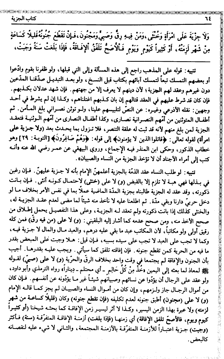 (وَلَا جِزْيَةَ عَلَى امْرَأَةٍ) لِقَوْلِهِ تَعَالَى: {قَاتِلُوا الَّذِينَ لا يُؤْمِنُونَ} [التوبة: 29] إلَى قَوْلِهِ: {وَهُمْ صَاغِرُونَ} [التوبة: 29] وَهُوَ خِطَابُ الذُّكُورِ، وَحَكَى ابْنُ الْمُنْذِرِ فِيهِ الْإِجْمَاعَ، وَرَوَى الْبَيْهَقِيُّ عَنْ عُمَرَ - رَضِيَ اللَّهُ عَنْهُ - " أَنَّهُ كَتَبَ إلَى أُمَرَاءِ الْأَجْنَادِ أَنْ لَا تُؤْخَذَ الْجِزْيَةُ مِنْ النِّسَاءِ وَالصِّبْيَانِ ". تَنْبِيهٌ: لَوْ طَلَبَ النِّسَاءُ عَقْدَ الذِّمَّةِ بِالْجِزْيَةِ أَعْلَمَهُنَّ الْإِمَامُ بِأَنَّهُ لَا جِزْيَةَ عَلَيْهِنَّ. فَإِنْ رَغِبْنَ فِي بَذْلِهَا فَهِيَ هِبَةٌ لَا تَلْزَمُ إلَّا بِالْقَبْضِ (وَ) لَا عَلَى (خُنْثَى) لِاحْتِمَالِ كَوْنِهِ أُنْثَى، فَإِنْ بَانَتْ ذُكُورَتُهُ، وَقَدْ عُقِدَ لَهُ الْجِزْيَةُ طَالَبْنَاهُ بِجِزْيَةِ الْمُدَّةِ الْمَاضِيَةِ عَمَلًا بِمَا فِي نَفْسِ الْأَمْرِ بِخِلَافِ مَا لَوْ دَخَلَ حَرْبِيٌّ دَارَنَا وَبَقِيَ مُدَّةً ثُمَّ اطَّلَعْنَا عَلَيْهِ لَا نَأْخُذُ مِنْهُ شَيْئًا لِمَا مَضَى لِعَدَمِ عَقْدِ الْجِزْيَةِ لَهُ، وَالْخُنْثَى كَذَلِكَ إذَا بَانَتْ ذُكُورَتُهُ وَلَمْ تُعْقَدْ لَهُ الْجِزْيَةُ، وَعَلَى هَذَا التَّفْصِيلِ يُحْمَلُ إطْلَاقُ مَنْ صَحَّحَ الْأَخْذَ مِنْهُ، وَمَنْ صَحَّحَ عَدَمَهُ كَمَا أَشَارَ إلَيْهِ الْبُلْقِينِيُّ: (وَ) لَا عَلَى (مَنْ فِيهِ رِقٌّ) ، فَمَنْ كُلُّهُ رَقِيقٌ أَوْلَى وَلَوْ مُكَاتَبًا؛ لِأَنَّ الْمُكَاتَبَ عَبْدٌ مَا بَقِيَ عَلَيْهِ دِرْهَمٌ، وَالْعَبْدُ مَالٌ وَالْمَالُ لَا جِزْيَةَ فِيهِ، وَكَمَا لَا تَجِبُ عَلَى الْعَبْدِ لَا تَجِبُ عَلَى سَيِّدِهِ بِسَبَبِهِ، فَإِنْ قِيلَ: هَلَّا وَجَبَتْ عَلَى الْمُبَعَّضِ بِقَدْرِ مَا فِيهِ مِنْ الْحُرِّيَّةِ كَمَنْ تَقَطَّعَ جُنُونُهُ فَإِنَّ إفَاقَتَهُ تُلَفَّقُ كَمَا سَيَأْتِي. وَيَجِبُ عَلَيْهِ بِقَدْرِهَا.