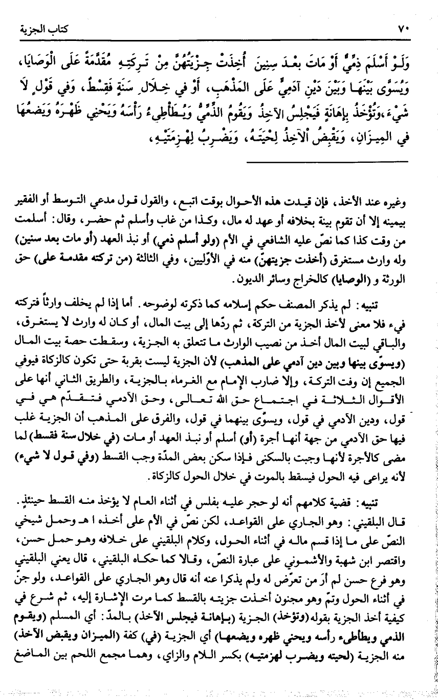 وَحَمَلَ شَيْخِي النَّصَّ عَلَى مَا إذَا قُسِّمَ مَالُهُ فِي أَثْنَاءِ الْحَوْلِ، وَكَلَامُ الْبُلْقِينِيُّ عَلَى خِلَافِهِ وَهُوَ حَمْلٌ حَسَنٌ، وَاقْتَصَرَ ابْنُ شُهْبَةَ وَالْأُشْمُونِيُّ عَلَى عِبَارَةِ النَّصِّ وَقَالَا كَمَا حَكَاهُ الْبُلْقِينِيُّ، قَالَ يَعْنِي الْبُلْقِينِيُّ وَهُوَ فَرْعٌ حَسَنٌ لَمْ أَرَ مَنْ تَعَرَّضَ لَهُ وَلَمْ يَذْكُرَا عَنْهُ أَنَّهُ قَالَ وَهُوَ الْجَارِي عَلَى الْقَوَاعِدِ، وَلَوْ جُنَّ فِي أَثْنَاءِ الْحَوْلِ وَتَمَّ وَهُوَ مَجْنُونٌ أُخِذَتْ جِزْيَتُهُ بِالْقِسْطِ كَمَا مَرَّتْ الْإِشَارَةُ إلَيْهِ. .
