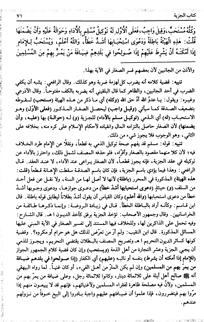 ـــــــــــــــــــــــــــــQوَالْأُذُنِ مِنْ الْجَانِبَيْنِ؛ لِأَنَّ بَعْضَهُمْ فَسَّرَ الصَّغَارَ فِي الْآيَةِ بِهَذَا. تَنْبِيهٌ: قَضِيَّةُ كَلَامِهِ أَنَّهُ يَضْرِبُ كُلَّ لِهْزِمَةٍ ضَرْبَةً وَهُوَ كَذَلِكَ. وَقَالَ الرَّافِعِيُّ: يُشْبِهُ أَنْ يَكْفِيَ الضَّرْبُ فِي أَحَدِ الْجَانِبَيْنِ، وَالظَّاهِرُ كَمَا قَالَ الْبُلْقِينِيُّ أَنَّهُ يَضْرِبُهُ بِالْكَفِّ مَفْتُوحًا. وَقَالَ الْأَذْرَعِيُّ وَغَيْرُهُ: وَيَقُولُ: يَا عَدُوَّ اللَّهِ أَدِّ حَقَّ اللَّهِ (وَكُلُّهُ) أَيْ مَا ذُكِرَ مِنْ هَذِهِ الْهَيْئَةِ (مُسْتَحَبٌّ) لِسُقُوطِهِ بِتَضْعِيفِ الصَّدَقَةِ كَمَا سَيَأْتِي (وَقِيلَ وَاجِبٌ) لِيَحْصُلَ الصَّغَارُ الْمَذْكُورُ (فَعَلَى الْأَوَّلِ) وَهُوَ الِاسْتِحْبَابُ (لَهُ) أَيْ الذِّمِّيِّ (تَوْكِيلُ مُسْلِمٍ بِالْأَدَاءِ) لِلْجِزْيَةِ (وَ) لَهُ (حَوَالَةٌ) بِهَا (عَلَيْهِ، وَأَنْ يَضْمَنَهَا) ؛ لِأَنَّ الصَّغَارَ حَاصِلٌ بِالْتِزَامِهِ الْمَالَ وَانْقِيَادِهِ لِأَحْكَامِ الْإِسْلَامِ عَلَى كُرْهٍ مِنْهُ بِخِلَافِهِ عَلَى الثَّانِي، وَهُوَ الْوُجُوبُ فَلَا يَجُوزُ شَيْءٌ مِنْ ذَلِكَ. تَنْبِيهٌ: قَوْلُهُ: مُسْلِمٌ قَدْ يُفْهِمُ صِحَّةَ تَوْكِيلِ الذِّمِّيِّ بِهِ قَطْعًا، وَنَقْلًا عَنْ الْإِمَامِ طَرْدُ الْخِلَافِ فِيهِ؛ لِأَنَّ كُلًّا مِنْهُمَا مَقْصُودٌ بِالصَّغَارِ وَأَقَرَّاهُ، فَلَوْ حَذَفَهُ الْمُصَنِّفُ لَشَمِلَ ذَلِكَ، وَاحْتُرِزَ بِالْأَدَاءِ عَنْ تَوْكِيلِهِ فِي عَقْدِ الْجِزْيَةِ، فَإِنَّهُ يَجُوزُ قَطْعًا؛ لِأَنَّ الصَّغَارَ يُرَاعَى عِنْدَ الْأَدَاءِ، لَا عِنْدَ الْعَقْدِ. قَالَ الرَّافِعِيُّ: وَهَذَا فِيمَا يُؤَدَّى بِاسْمِ الْجِزْيَةِ، فَإِنْ كَانَ بِاسْمِ الصَّدَقَةِ سَقَطَتْ الْإِهَانَةُ قَطْعًا (قُلْتُ: هَذِهِ الْهَيْئَةُ) الْمَذْكُورَةُ فِي الْمُحَرَّرِ (بَاطِلَةٌ) ؛ لِأَنَّهَا لَا أَصْلَ لَهَا مِنْ السُّنَّةِ، وَلَا نُقِلَ عَنْ فِعْلِ أَحَدٍ مِنْ السَّلَفِ (وَ) حِينَئِذٍ (دَعْوَى اسْتِحْبَابِهَا أَشَدُّ خَطَأً) مِنْ دَعْوَى جَوَازِهَا، وَدَعْوَى وُجُوبِهَا أَشَدُّ خَطَأً مِنْ دَعْوَى اسْتِحْبَابِهَا (وَاَللَّهُ أَعْلَمُ) وَكَانَ الْقِيَاسُ أَنْ يَقُولَ: أَشَدُّ بُطْلَانًا لِيُطَابِقَ قَوْلَهُ: بَاطِلَةٌ. قَالَ ابْنُ قَاسِمٍ: وَكَأَنَّهُ أَرَادَ بِالْبَاطِلَةِ الْخَطَأَ. قَالَ فِي زِيَادَةِ الرَّوْضَةِ: وَإِنَّمَا ذَكَرَهَا طَائِفَةٌ مِنْ الْخُرَاسَانِيِّينَ. وَقَالَ وَجُمْهُورُ الْأَصْحَابِ: تُؤْخَذُ الْجِزْيَةُ بِرِفْقٍ كَأَخْذِ الدُّيُونِ. اهـ.