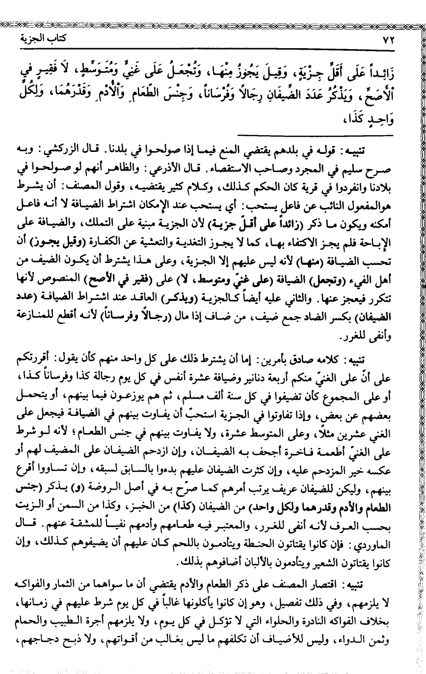 وَالثَّانِي عَلَيْهِ أَيْضًا كَالْجِزْيَةِ (وَيَذْكُرُ) الْعَاقِدُ عِنْدَ اشْتِرَاطِ الضِّيَافَةِ (عَدَدَ الضِّيفَانِ) بِكَسْرِ الضَّادِ جَمْعُ ضَيْفٍ، مِنْ ضَافَ إذَا مَالَ (رِجَالًا وَفُرْسَانًا) ؛ لِأَنَّهُ أَقْطَعُ لِلْمُنَازَعَةِ وَأَنْفَى لِلْغَرَرِ. تَنْبِيهٌ: كَلَامُهُ صَادِقٌ بِأَمْرَيْنِ: إمَّا أَنْ يَشْتَرِطَ ذَلِكَ عَلَى كُلِّ وَاحِدٍ مِنْهُمْ كَأَنْ يَقُولَ: أَقْرَرْتُكُمْ عَلَى أَنَّ عَلَى الْغَنِيِّ مِنْكُمْ أَرْبَعَةَ دَنَانِيرَ وَضِيَافَةَ عَشَرَةِ أَنْفُسٍ فِي كُلِّ يَوْمٍ رَجَّالَةً كَذَا وَفُرْسَانًا كَذَا، أَوْ عَلَى الْمَجْمُوعِ كَأَنْ تُضَيِّفُوا فِي كُلِّ سَنَةٍ أَلْفَ مُسْلِمٍ، ثُمَّ هُمْ يُوَزِّعُونَ فِيمَا بَيْنَهُمْ، أَوْ يَتَحَمَّلُ بَعْضُهُمْ عَنْ بَعْضٍ، وَإِذَا تَفَاوَتُوا فِي الْجِزْيَةِ اُسْتُحِبَّ أَنْ يُفَاوِتَ بَيْنَهُمْ فِي الضِّيَافَةِ فَيَجْعَلُ عَلَى الْغَنِيِّ عِشْرِينَ مَثَلًا، وَعَلَى الْمُتَوَسِّطِ عَشَرَةً، وَلَا يُفَاوِتُ بَيْنَهُمْ فِي جِنْسِ الطَّعَامِ؛ لِأَنَّهُ لَوْ شَرَطَ عَلَى الْغَنِيِّ أَطْعِمَةً فَاخِرَةً أَجْحَفَ بِهِ الضِّيفَانَ، وَإِنْ ازْدَحَمَ الضِّيفَانُ عَلَى الْمُضِيفِ لَهُمْ أَوْ عَكْسُهُ خُيِّرَ الْمُزْدَحَمُ عَلَيْهِ، وَإِنْ كَثُرَتْ الضِّيفَانُ عَلَيْهِمْ بَدَءُوا بِالسَّابِقِ لِسَبْقِهِ، وَإِنْ تَسَاوَوْا أُقْرِعَ بَيْنَهُمْ، وَلْيَكُنْ لِلضِّيفَانِ عَرِيفٌ يُرَتِّبُ أَمْرَهُمْ كَمَا صَرَّحَ بِهِ فِي أَصْلِ الرَّوْضَةِ (وَ) يُذْكَرُ (جِنْسُ الطَّعَامِ وَالْأُدْمِ وَقَدْرُهُمَا وَلِكُلِّ وَاحِدٍ) مِنْ الضِّيفَانِ (كَذَا) مِنْ الْخُبْزِ، وَكَذَا مِنْ السَّمْنِ أَوْ الزَّيْتِ بِحَسَبِ الْعُرْفِ؛ لِأَنَّهُ أَنْفَى لِلْغَرَرِ، وَالْمُعْتَبَرُ فِيهِ طَعَامُهُمْ وَأُدْمُهُمْ نَفْيًا لِلْمَشَقَّةِ عَنْهُمْ. قَالَ الْمَاوَرْدِيُّ: فَإِنْ كَانُوا يَقْتَاتُونَ الْحِنْطَةَ وَيَتَأَدَّمُونَ بِاللَّحْمِ كَانَ عَلَيْهِمْ أَنْ يُضَيِّفُوهُمْ كَذَلِكَ، وَإِنْ كَانُوا يَقْتَاتُونَ الشَّعِيرَ وَيَتَأَدَّمُونَ بِالْأَلْبَانِ أَضَافُوهُمْ بِذَلِكَ.