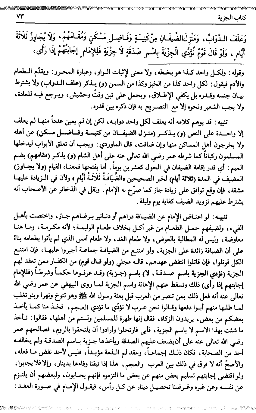 وَعَلَفَ الدَّوَابِّ، وَمَنْزِلَ الضِّيفَانِ مِنْ كَنِيسَةٍ وَفَاضِلِ مَسْكَنٍ وَمُقَامَهُمْ، وَلَا يُجَاوِزُ ثَلَاثَةَ أَيَّامٍ.
