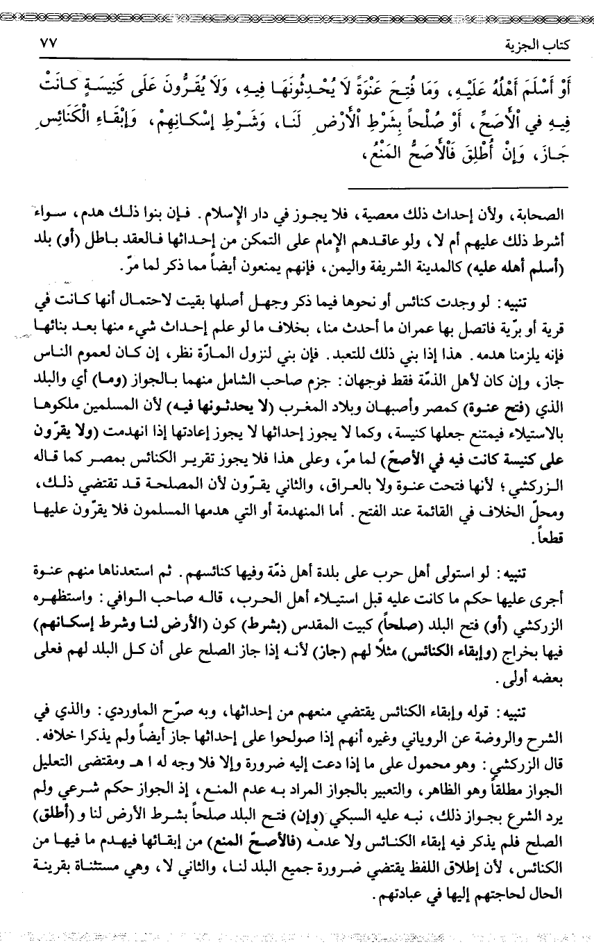 تَنْبِيهٌ: قَوْلُهُ: " وَإِبْقَاءِ الْكَنَائِسِ " يَقْتَضِي مَنْعَهُمْ مِنْ إحْدَاثِهَا، وَبِهِ صَرَّحَ الْمَاوَرْدِيُّ: وَاَلَّذِي فِي الشَّرْحِ وَالرَّوْضَةِ عَنْ الرُّويَانِيِّ وَغَيْرِهِ أَنَّهُمْ إذَا صُولِحُوا عَلَى إحْدَاثِهَا جَازَ أَيْضًا وَلَمْ يَذْكُرَا خِلَافَهُ. قَالَ الزَّرْكَشِيُّ: وَهُوَ مَحْمُولٌ مَا إذَا دَعَتْ إلَيْهِ ضَرُورَةٌ وَإِلَّا فَلَا وَجْهَ لَهُ اهـ.