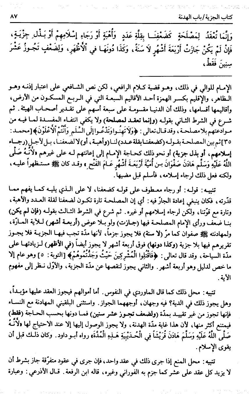 ثُمَّ شَرَعَ فِي الشَّرْطِ الثَّالِثِ بِقَوْلِهِ (فَإِنْ لَمْ يَكُنْ) بِنَا ضَعْفٌ وَرَأَى الْإِمَامُ الْمَصْلَحَةَ فِيهَا (جَازَتْ) وَلَوْ بِلَا عِوَضٍ (أَرْبَعَةَ أَشْهُرٍ) لِلْآيَةِ الْمَارَّةِ، وَلِمُهَادَنَتِهِ - صَلَّى اللَّهُ عَلَيْهِ وَسَلَّمَ - صَفْوَانَ كَمَا مَرَّ (لَا سَنَةً) فَلَا يَجُوزُ جَزْمًا؛ لِأَنَّهَا مُدَّةٌ تَجِبُ فِيهَا الْجِزْيَةُ فَلَا يَجُوزُ تَقْرِيرُهُمْ فِيهَا بِلَا جِزْيَةٍ (وَكَذَا دُونَهَا) فَوْقَ أَرْبَعَةِ أَشْهُرٍ لَا يَجُوزُ أَيْضًا (فِي الْأَظْهَرِ) لِزِيَادَتِهَا عَلَى مُدَّةِ السِّيَاحَةِ، وَقَدْ قَالَ تَعَالَى: {فَاقْتُلُوا الْمُشْرِكِينَ حَيْثُ وَجَدْتُمُوهُمْ} [التوبة: 5] هُوَ عَامٌّ إلَّا مَا خُصَّ لِدَلِيلٍ وَهُوَ أَرْبَعَةُ أَشْهُرٍ. وَالثَّانِي يَجُوزُ لِنَقْصِهَا عَنْ مُدَّةِ الْجِزْيَةِ، وَالْأَوَّلُ نَظَرَ إلَى مَفْهُومِ الْآيَةِ. تَنْبِيهٌ: مَحَلُّ ذَلِكَ كَمَا قَالَ الْمَاوَرْدِيُّ فِي النُّفُوسِ. أَمَّا أَمْوَالُهُمْ فَيَجُوزُ الْعَقْدُ عَلَيْهَا مُؤَبَّدًا، وَهَلْ يَجُوزُ ذَلِكَ فِي الدِّيَةِ؟ فِيهِ وَجْهَانِ، أَوْجَهُهُمَا الْجَوَازُ. وَاسْتَثْنَى الْبُلْقِينِيُّ الْمُهَادَنَةَ مَعَ النِّسَاءِ فَإِنَّهَا تَجُوزُ مِنْ غَيْرِ تَقْيِيدٍ بِمُدَّةٍ (وَلِضَعْفٍ تَجُوزُ عَشْرَ سِنِينَ) فَمَا دُونَهَا بِحَسَبِ الْحَاجَةِ (فَقَطْ) فَيُمْتَنَعُ أَكْثَرُ مِنْهَا؛ لِأَنَّ هَذَا غَايَةُ مُدَّةِ الْهُدْنَةِ، وَلَا يَجُوزُ الْوُصُولُ إلَيْهَا إلَّا عِنْدَ الِاحْتِيَاجِ لَهَا؛ لِأَنَّهُ - صَلَّى اللَّهُ عَلَيْهِ وَسَلَّمَ - «هَادَنَ قُرَيْشًا فِي الْحُدَيْبِيَةِ هَذِهِ الْمُدَّةَ» رَوَاهُ أَبُو دَاوُد.