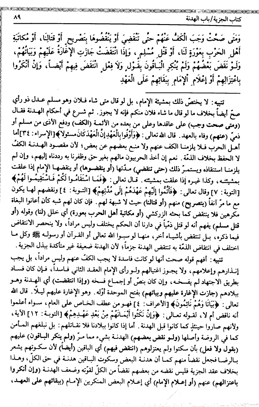 ثُمَّ شَرَعَ فِي أَحْكَامِ الْهُدْنَةِ فَقَالَ (وَمَتَى صَحَّتْ وَجَبَ) عَلَى عَاقِدِهَا وَعَلَى مَنْ بَعْدَهُ مِنْ الْأَئِمَّةِ (الْكَفُّ) وَدَفْعُ الْأَذَى مِنْ مُسْلِمٍ أَوْ ذِمِّيٍّ (عَنْهُمْ) وَفَاءً بِالْعَهْدِ. قَالَ اللَّهُ تَعَالَى: {وَأَوْفُوا بِالْعَهْدِ إِنَّ الْعَهْدَ كَانَ مَسْئُولا} [الإسراء: 34] أَمَّا أَهْلُ الْحَرْبِ فَلَا يَلْزَمُنَا الْكَفُّ عَنْهُمْ وَلَا مَنْعُ بَعْضِهِمْ عَنْ بَعْضٍ؛ لِأَنَّ مَقْصُودَ الْهُدْنَةِ الْكَفُّ لَا الْحِفْظُ بِخِلَافِ الذِّمَّةِ. نَعَمْ إنْ أَخَذَ الْحَرْبِيُّونَ مَالَهُمْ بِغَيْرِ حَقٍّ وَظَفِرْنَا بِهِ رَدَدْنَاهُ إلَيْهِمْ، وَإِنْ لَمْ يَلْزَمْنَا اسْتِنْقَاذُهُ وَيَسْتَمِرُّ ذَلِكَ (حَتَّى تَنْقَضِيَ) مُدَّتُهَا (أَوْ يَنْقُضُوهَا) أَوْ يَنْقُضَهَا الْإِمَامُ إذَا عُلِّقَتْ بِمَشِيئَتِهِ، وَكَذَا غَيْرُهُ إذَا عُلِّقَتْ بِمَشِيئَتِهِ. قَالَ تَعَالَى: {فَمَا اسْتَقَامُوا لَكُمْ فَاسْتَقِيمُوا لَهُمْ} [التوبة: 7] وَقَالَ تَعَالَى: {فَأَتِمُّوا إِلَيْهِمْ عَهْدَهُمْ إِلَى مُدَّتِهِمْ} [التوبة: 4] وَنَقْضُهُمْ لَهَا يَكُونُ مَعَ مَا مَرَّ آنِفًا (بِتَصْرِيحٍ) مِنْهُمْ (أَوْ قِتَالِنَا) حَيْثُ لَا شُبْهَةَ لَهُمْ. فَإِنْ كَانَ لَهُمْ شُبْهَةٌ كَأَنْ أَعَانُوا الْبُغَاةَ مُكْرَهِينَ فَلَا يُنْتَقَضُ كَمَا بَحَثَهُ الزَّرْكَشِيُّ (أَوْ مُكَاتَبَةِ أَهْلِ الْحَرْبِ بِعَوْرَةٍ) أَيْ خَلَلٍ (لَنَا) وَقَوْلُهُ (أَوْ قَتْلِ مُسْلِمٍ) يُفْهِمُ أَنَّهُ لَوْ قَتَلَ ذِمِّيًّا فِي دَارِنَا أَنَّ الْحُكْمَ يَخْتَلِفُ وَلَيْسَ مُرَادًا، وَلَا يَنْحَصِرُ الِانْتِقَاضُ فِيمَا ذَكَرَهُ، بَلْ تُنْتَقَضُ بِأَشْيَاءَ أُخَرَ، مِنْهَا لَوْ سَبُّوا اللَّهَ تَعَالَى أَوْ الْقُرْآنَ أَوْ رَسُولَهُ - صَلَّى اللَّهُ عَلَيْهِ وَسَلَّمَ - وَكُلُّ مَا اُخْتُلِفَ فِي انْتِقَاضِ الذِّمَّةِ بِهِ تُنْتَقَضُ الْهُدْنَةُ جَزْمًا؛ لِأَنَّ الْهُدْنَةَ ضَعِيفَةٌ غَيْرُ مُتَأَكَّدَةٍ بِبَذْلِ الْجِزْيَةِ.