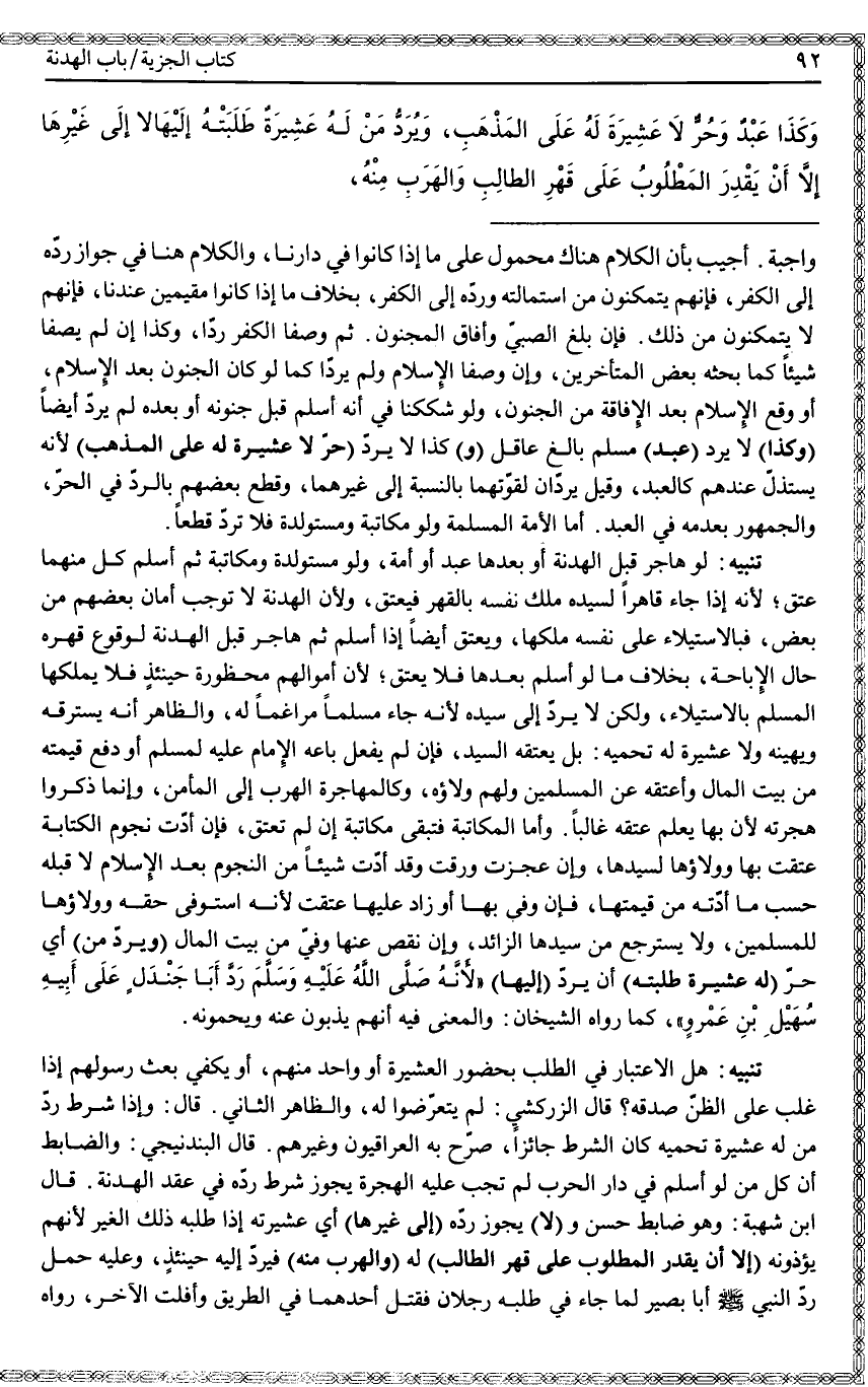 تَنْبِيهٌ: لَوْ هَاجَرَ قَبْلَ الْهُدْنَةِ أَوْ بَعْدَهَا عَبْدٌ أَوْ أَمَةٌ، وَلَوْ مُسْتَوْلَدَةً وَمُكَاتَبَةً ثُمَّ أَسْلَمَ كُلٌّ مِنْهُمَا عَتَقَ؛ لِأَنَّهُ إذَا جَاءَ قَاهِرًا لِسَيِّدِهِ مَلَكَ نَفْسَهُ بِالْقَهْرِ فَيَعْتِقُ، وَلِأَنَّ الْهُدْنَةَ لَا تُوجِبُ أَمَانَ بَعْضِهِمْ مِنْ بَعْضٍ، فَبِالِاسْتِيلَاءِ عَلَى نَفْسِهِ مَلَكَهَا، وَيَعْتِقُ أَيْضًا إذَا أَسْلَمَ ثُمَّ هَاجَرَ قَبْلَ الْهُدْنَةِ لِوُقُوعِ قَهْرِهِ حَالَ الْإِبَاحَةِ، بِخِلَافِ مَا لَوْ أَسْلَمَ بَعْدَهَا فَلَا يَعْتِقُ؛ لِأَنَّ أَمْوَالَهُمْ مَحْظُورَةٌ حِينَئِذٍ فَلَا يَمْلِكُهَا الْمُسْلِمُ بِالِاسْتِيلَاءِ، وَلَكِنْ لَا يُرَدُّ إلَى سَيِّدِهِ؛ لِأَنَّهُ جَاءَ مُسْلِمًا مُرَاغِمًا لَهُ، وَالظَّاهِرُ أَنَّهُ يَسْتَرِقُّهُ وَيُهِينُهُ وَلَا عَشِيرَةَ لَهُ تَحْمِيهِ: بَلْ يُعْتِقُهُ السَّيِّدُ، فَإِنْ لَمْ يَفْعَلْ بَاعَهُ الْإِمَامُ عَلَيْهِ لِمُسْلِمٍ أَوْ دَفَعَ قِيمَتَهُ مِنْ بَيْتِ الْمَالِ وَأَعْتَقَهُ عَنْ الْمُسْلِمِينَ وَلَهُمْ وَلَاؤُهُ، وَكَالْمُهَاجَرَةِ الْهَرَبُ إلَى الْمَأْمَنِ، وَإِنَّمَا ذَكَرُوا هِجْرَتَهُ؛ لِأَنَّ بِهَا يُعْلَمُ عِتْقُهُ غَالِبًا. وَأَمَّا الْمُكَاتَبَةُ فَتَبْقَى مُكَاتَبَةً إنْ لَمْ تُعْتَقْ، فَإِنْ أَدَّتْ نُجُومَ الْكِتَابَةِ عَتَقَتْ بِهَا وَوَلَاؤُهَا لِسَيِّدِهَا، وَإِنْ عَجَزَتْ وَرَقَّتْ وَقَدْ أَدَّتْ شَيْئًا مِنْ النُّجُومِ بَعْدَ الْإِسْلَامِ لَا قَبْلَهُ حَسَبَ مَا أَدَّتْهُ مِنْ قِيمَتِهَا، فَإِنْ وَفِيَ بِهَا أَوْ زَادَ عَلَيْهَا عَتَقَتْ؛ لِأَنَّهُ اسْتَوْفَى حَقَّهُ وَوَلَاؤُهَا لِلْمُسْلِمِينَ، وَلَا يَسْتَرْجِعُ مِنْ سَيِّدِهَا الزَّائِدُ، وَإِنْ نَقَصَ عَنْهَا وُفِّيَ مِنْ بَيْتِ الْمَالِ (وَيُرَدُّ مَنْ) أَيْ حُرٌّ (لَهُ عَشِيرَةٌ طَلَبَتْهُ) أَنْ يُرَدَّ (إلَيْهَا) ؛ لِأَنَّهُ - صَلَّى اللَّهُ عَلَيْهِ وَسَلَّمَ - «رَدَّ أَبَا جَنْدَلٍ عَلَى أَبِيهِ سُهَيْلِ بْنِ عَمْرٍو» ، كَمَا رَوَاهُ الشَّيْخَانِ: وَالْمَعْنَى فِيهِ أَنَّهُمْ يَذُبُّونَ عَنْهُ وَيَحْمُونَهُ. تَنْبِيهٌ: هَلْ الِاعْتِبَارُ فِي الطَّلَبِ بِحُضُورِ الْعَشِيرَةِ أَوْ وَاحِدٍ مِنْهُمْ، أَوْ يَكْفِي بَعْثُ رَسُولِهِمْ إذَا غَلَبَ عَلَى الظَّنِّ صِدْقُهُ؟ قَالَ الزَّرْكَشِيُّ: لَمْ يَتَعَرَّضُوا لَهُ، وَالظَّاهِرُ الثَّانِي. قَالَ: وَإِذَا شُرِطَ رَدُّ مَنْ لَهُ عَشِيرَةٌ تَحْمِيهِ كَانَ الشَّرْطُ جَائِزًا، صَرَّحَ بِهِ الْعِرَاقِيُّونَ وَغَيْرُهُمْ.
