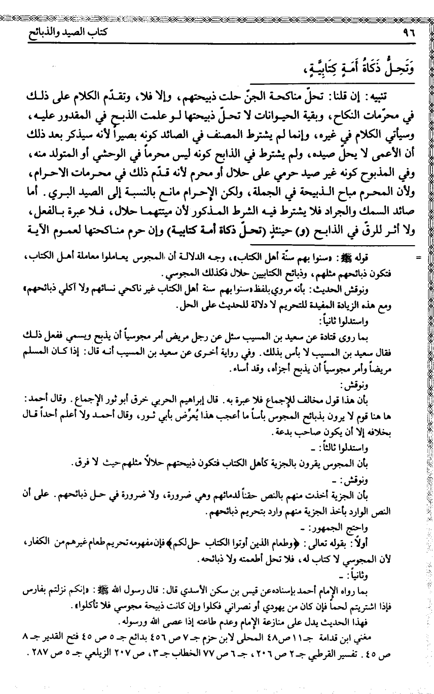 ـــــــــــــــــــــــــــــQتَنْبِيهٌ: إنْ قُلْنَا: تَحِلُّ مُنَاكَحَةُ الْجِنِّ حَلَّتْ ذَبِيحَتُهُمْ، وَإِلَّا فَلَا، وَتَقَدَّمَ الْكَلَامُ عَلَى ذَلِكَ فِي مُحَرَّمَاتِ النِّكَاحِ، وَبَقِيَّةُ الْحَيَوَانَاتِ لَا تَحِلُّ ذَبِيحَتُهَا لَوْ عَلِمَتْ الذَّبْحَ فِي الْمَقْدُورِ عَلَيْهِ، وَسَيَأْتِي الْكَلَامُ فِي غَيْرِهِ، وَإِنَّمَا لَمْ يَشْتَرِطْ الْمُصَنِّفُ فِي الصَّائِدِ كَوْنَهُ بَصِيرًا؛ لِأَنَّهُ سَيَذْكُرُ بَعْدَ ذَلِكَ أَنَّ الْأَعْمَى لَا يَحِلُّ صَيْدُهُ، وَلَمْ يَشْتَرِطْ فِي الذَّابِحِ كَوْنَهُ لَيْسَ مُحَرَّمًا فِي الْوَحْشِيِّ أَوْ الْمُتَوَلَّدِ مِنْهُ، وَفِي الْمَذْبُوحِ كَوْنَهُ غَيْرَ صَيْدٍ حَرَمِيٍّ عَلَى حَلَالٍ أَوْ مُحَرَّمٍ؛ لِأَنَّهُ قَدَّمَ ذَلِكَ فِي مُحَرَّمَاتِ الْإِحْرَامِ، وَلِأَنَّ الْمُحْرِمَ مُبَاحُ الذَّبِيحَةِ فِي الْجُمْلَةِ، وَلَكِنَّ الْإِحْرَامَ مَانِعٌ بِالنِّسْبَةِ إلَى الصَّيْدِ الْبَرِّيِّ. أَمَّا صَائِدُ السَّمَكِ وَالْجَرَادِ فَلَا يُشْتَرَطُ فِيهِ الشَّرْطُ الْمَذْكُورُ؛ لِأَنَّ مَيْتَتَهُمَا حَلَالٌ، فَلَا عِبْرَةَ بِالْفِعْلِ، وَلَا أَثَرَ لِلرِّقِّ فِي الذَّابِحِ (وَ) حِينَئِذٍ (تَحِلُّ ذَكَاةُ أَمَةٍ كِتَابِيَّةٍ) وَإِنْ حُرِّمَ مُنَاكَحَتُهَا لِعُمُومِ الْآيَةِ