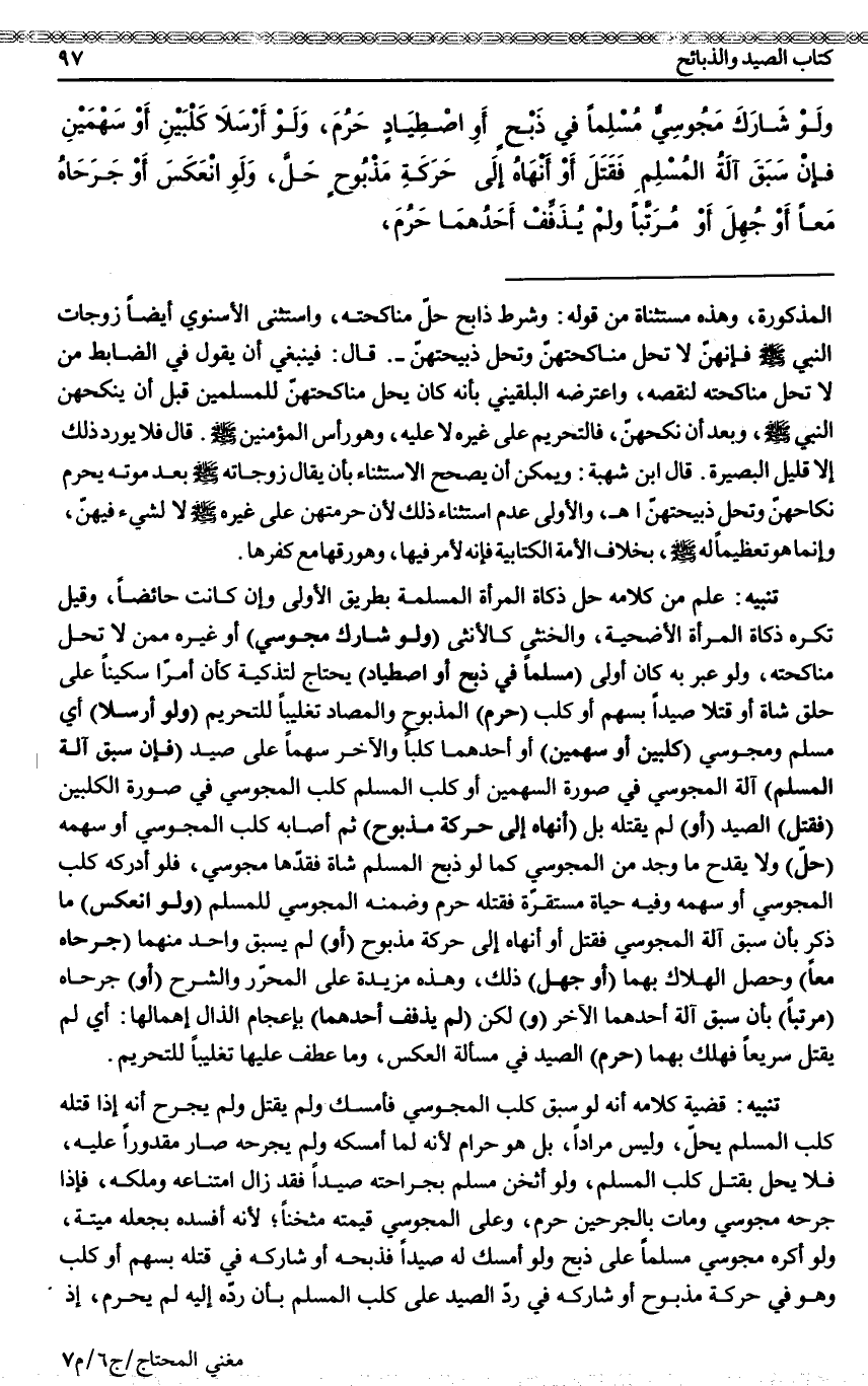 وَالْأَوْلَى عَدَمُ اسْتِثْنَاءِ ذَلِكَ؛ لِأَنَّ حُرْمَتَهُنَّ عَلَى غَيْرِهِ - صَلَّى اللَّهُ عَلَيْهِ وَسَلَّمَ - لَا لِشَيْءٍ فِيهِنَّ، وَإِنَّمَا هُوَ تَعْظِيمًا لَهُ - صَلَّى اللَّهُ عَلَيْهِ وَسَلَّمَ - بِخِلَافِ الْأَمَةِ الْكِتَابِيَّةِ فَإِنَّهُ لِأَمْرٍ فِيهَا، وَهُوَ رِقُّهَا مَعَ كُفْرِهَا. تَنْبِيهٌ: عُلِمَ مِنْ كَلَامِهِ حِلُّ ذَكَاةِ الْمَرْأَةِ الْمُسْلِمَةِ بِطَرِيقِ الْأَوْلَى وَإِنْ كَانَتْ حَائِضًا، وَقِيلَ تُكْرَهُ ذَكَاةُ الْمَرْأَةِ الْأُضْحِيَّةَ، وَالْخُنْثَى كَالْأُنْثَى (وَلَوْ شَارَكَ مَجُوسِيٌّ) أَوْ غَيْرُهُ مِمَّنْ لَا تَحِلُّ مُنَاكَحَتُهُ، وَلَوْ عَبَّرَ بِهِ كَانَ أَوْلَى (مُسْلِمًا فِي ذَبْحٍ أَوْ اصْطِيَادٍ) يَحْتَاجُ لِتَذْكِيَةٍ كَأَنْ أَمَرَّا سِكِّينًا عَلَى حَلْقِ شَاةٍ أَوْ قَتَلَا صَيْدًا بِسَهْمٍ أَوْ كَلْبٍ (حَرُمَ) الْمَذْبُوحُ وَالْمُصَادُ تَغْلِيبًا لِلتَّحْرِيمِ (وَلَوْ أَرْسَلَا) أَيْ مُسْلِمٌ وَمَجُوسِيٌّ (كَلْبَيْنِ أَوْ سَهْمَيْنِ) أَوْ أَحَدُهُمَا كَلْبًا وَالْآخَرُ سَهْمًا عَلَى صَيْدٍ (فَإِنْ سَبَقَ آلَةُ الْمُسْلِمِ) آلَةَ الْمَجُوسِيِّ فِي صُورَةِ السَّهْمَيْنِ أَوْ كَلْبُ الْمُسْلِمِ كَلْبَ الْمَجُوسِيِّ فِي صُورَةِ الْكَلْبَيْنِ (فَقَتَلَ) الصَّيْدَ (أَوْ) لَمْ يَقْتُلْهُ بَلْ (أَنْهَاهُ إلَى حَرَكَةِ مَذْبُوحٍ) ثُمَّ أَصَابَهُ كَلْبُ الْمَجُوسِيِّ أَوْ سَهْمُهُ (حَلَّ) وَلَا يَقْدَحُ مَا وُجِدَ مِنْ الْمَجُوسِيِّ كَمَا لَوْ ذَبَحَ الْمُسْلِمُ شَاةً فَقَدَّهَا مَجُوسِيٌّ، فَلَوْ أَدْرَكَهُ كَلْبُ الْمَجُوسِيِّ أَوْ سَهْمُهُ وَفِيهِ حَيَاةٌ مُسْتَقِرَّةٌ فَقَتَلَهُ حَرُمَ وَضَمِنَهُ الْمَجُوسِيُّ لِلْمُسْلِمِ.