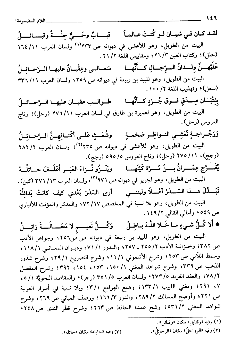 البيت من الطويل، وهر للبيد بن ربيعة في ديوانه ص ص 256؛ وجواهر الأدب ص 382؛ وخزانة الأدب 2/ 255 - 257؛ والدرر 1/ 71؛ وديوان المعاني 1/ 118؛ وسمط اللآلي ص 253؛ وشرح الأشموني 1/ 11؛ وشرح التصريح 1/ 29؛ وشرح شذور الذهب ص 339؛ وشرح شواهد المغني 1/ 150، 153، 154، 392؛ وشرح المفصل 2/ 78؛ والعقد الفريد 5/ 273؛ ولسان العرب 5/ 351 (رجز)؛ والمقاصد النحوية 1/ 5، 7، 291؛ ومغني اللبيب 1/ 133؛ وهمع الهوامع 1/ 3؛ وبلا نسبة في أسرار العربية ص 221؛ وأوضح المسالك 2/ 289؛ والدرر 3/ 166؛ ورصف المباني ص 269؛ وشرح شواهد المغني 2/ 531؛ وشرح عمدة الحافظ ص 263؛ وشرح قطر الندى ص 248؛