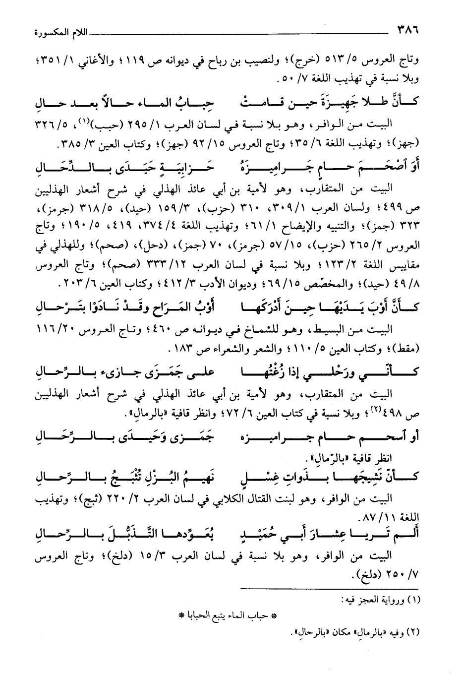 البيت من المتقارب، وهو لأمية بن أبي عائذ الهذلي في شرح أشعار الهذليين ص 498 (¬2)؛ وبلا نسبة في كتاب العين 6/ 72؛ وانظر قافية (بالرمال).