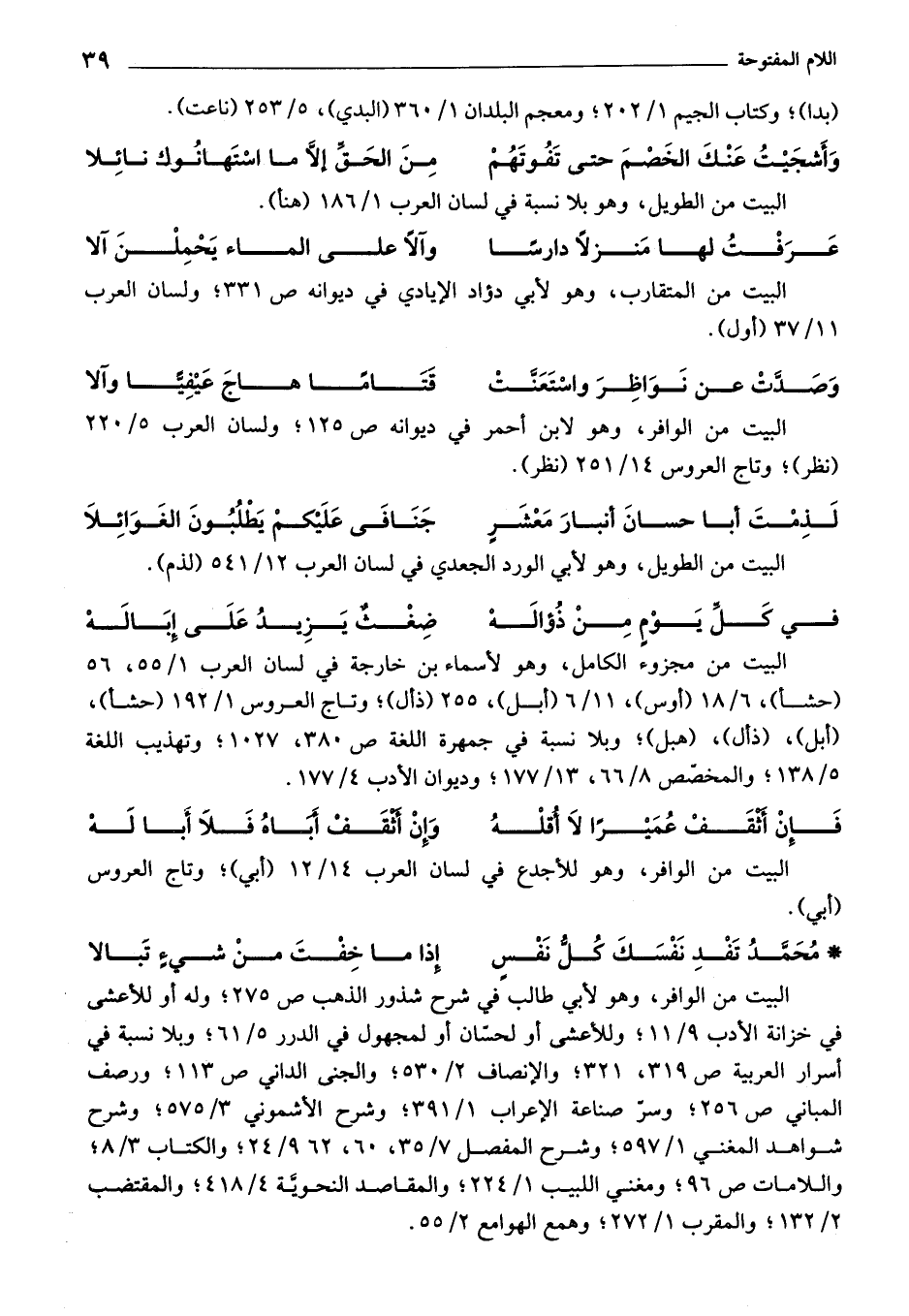 البيت من الوافر، وهو لأبي طالب في شرح شذور الذهب ص 275؛ وله أو للأعشى في خزانة الأدب 9/ 11؛ وللأعشى أو لحسّان أو لمجهول في الدرر 5/ 61؛ وبلا نسبة في أسرار العربية ص 319، 321؛ والإنصاف 2/ 530؛ والجني الداني ص 113؛ ورصف المباني ص 256؛ وسر صناعة الإعراب 1/ 391؛ وشرح الأشموني 3/ 575؛ وشرح شواهد المغني 1/ 597؛ وشرح المفصل 7/ 35، 60، 962/ 24؛ والكتاب 3/ 8؛ واللامات ص 96؛ ومغني اللبيب 1/ 224؛ والمقاصد النحوية 4/ 418؛ والمقتضب 2/ 132؛ والمقرب 1/ 272؛ وهمع الهوامع 2/ 55.