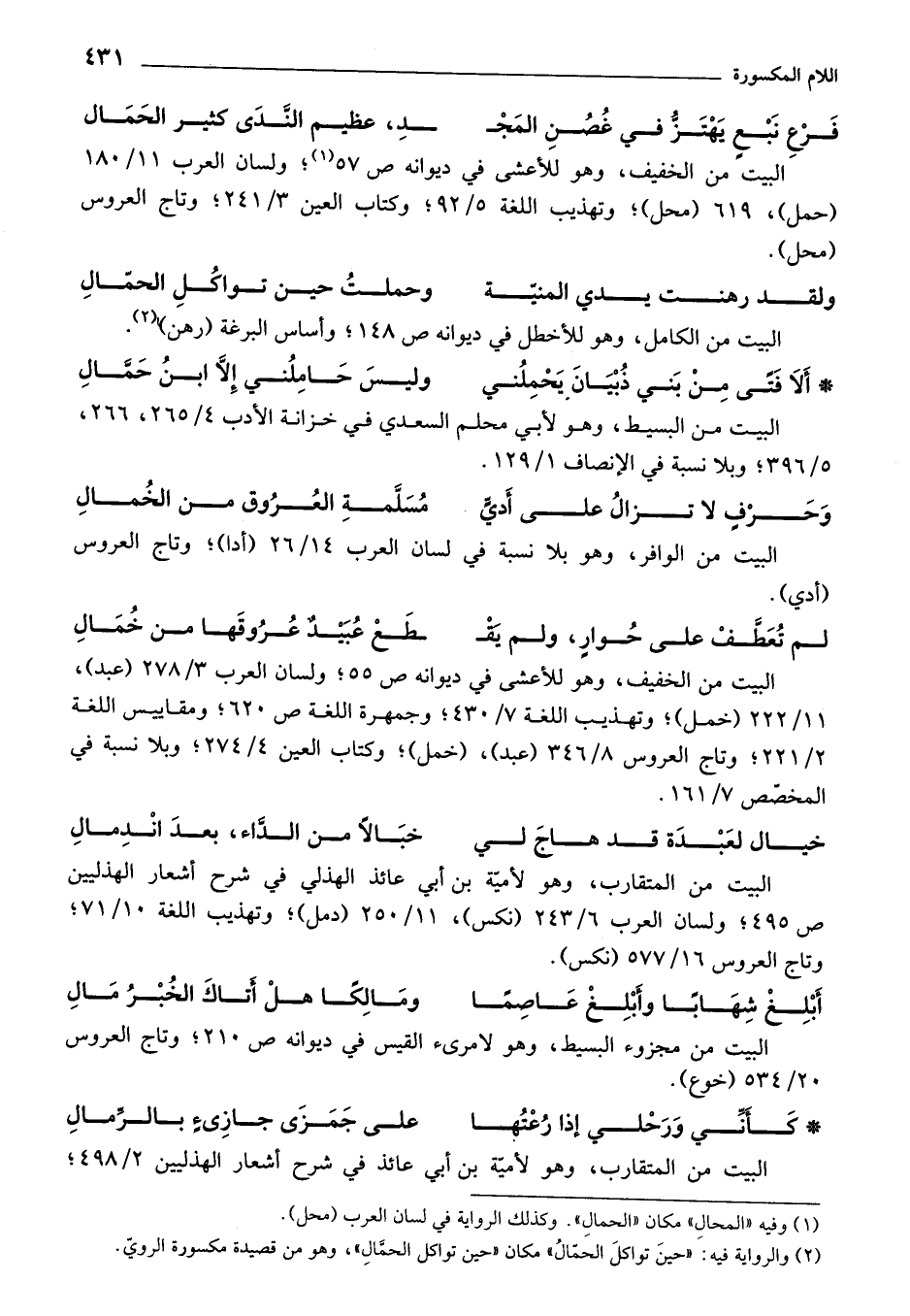 (¬2) والرواية فيه: "حين تواكل الحمال" مكان "حين تواكل الحمال"، وهو من قصيدة مكسورة الروي.