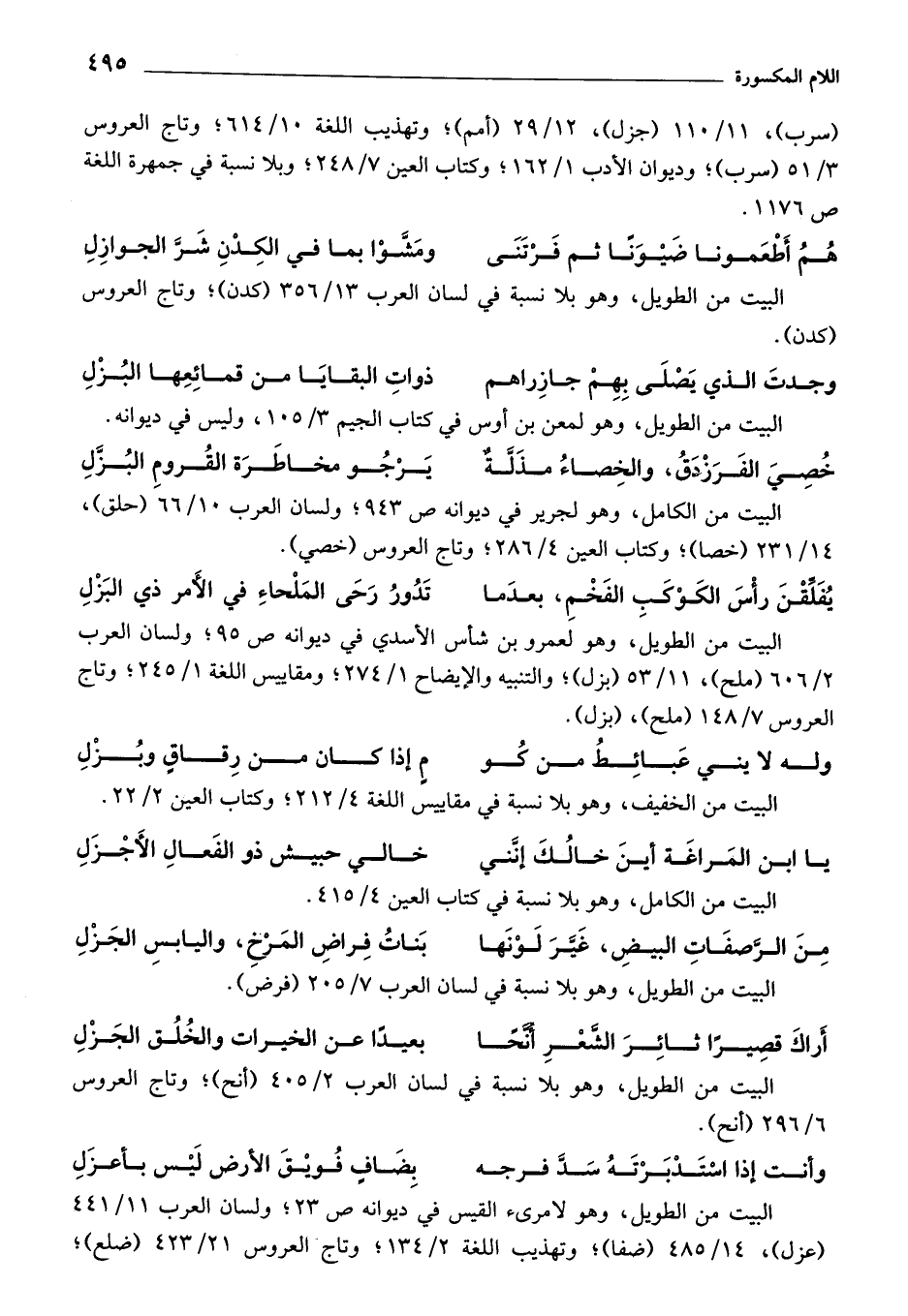 (سرب)، 11/ 110 (جزل)، 12/ 29 (أمم)؛ وتهذيب اللغة 10/ 614؛ وتاج العروس 3/ 51 (سرب)؛ وديوان الأدب 1/ 162؛ وكتاب العين 7/ 248؛ وبلا نسبة في جمهرة اللغة ص 1176.