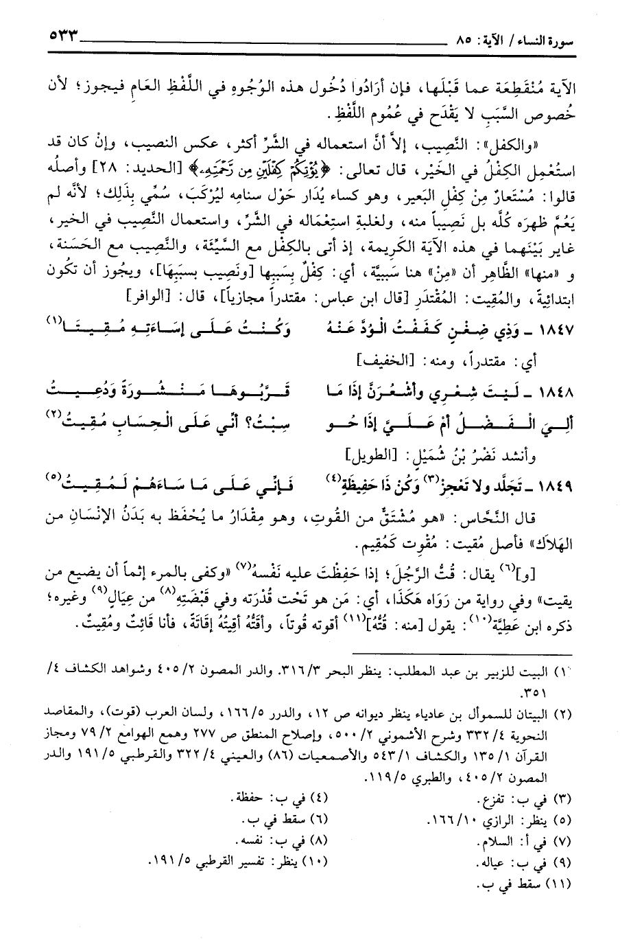 «والكفل» : النَّصِيب، إلا أنَّ استعماله في الشَّرِّ أكثرن عكس النصيب، وأنْ كان قد استُعْمِل الكِفْلُ في الخَيْرِ، قال تعالى: {يُؤْتِكُمْ كِفْلَيْنِ مِن رَّحْمَتِهِ} [الحديد: 28] وأصلُه قالوا: مُسْتَعَارٌ مِنْ كِفْلِ البَعير، وهو كساء يُدَارُ حَوْلَ سِنَامِهِ ليُرْكَبَ، سُمِّي بِذَلِك؛ لأنَّه لم يَعُمَّ ظهرهَ كُلَّه بل نَصِيباً منه، ولغلبةِ استِعْمَالِه في الشَّرِّ، واستعمال النَّصِيب في الخير، غاير بَيْنَهُمَا في هذه الآيَة الكَريمة؛ إذ أتى بالكِفْل مع السَّيِّئَة، والنَّصِيب مع الحَسَنة، و «منها» الظَّاهِر أن «مِنْ» هنا سَببيَّة، أي: كِفْلٌ بِسَبِبها [ونَصِيب بسبِبها] ، ويجُوز أن تكُون ابتدائِيةٌ، والمُقِيت: المُقْتَدَر [قال: ابن عباس: مقتدراً مجازياً] ، قال: [الوافر]