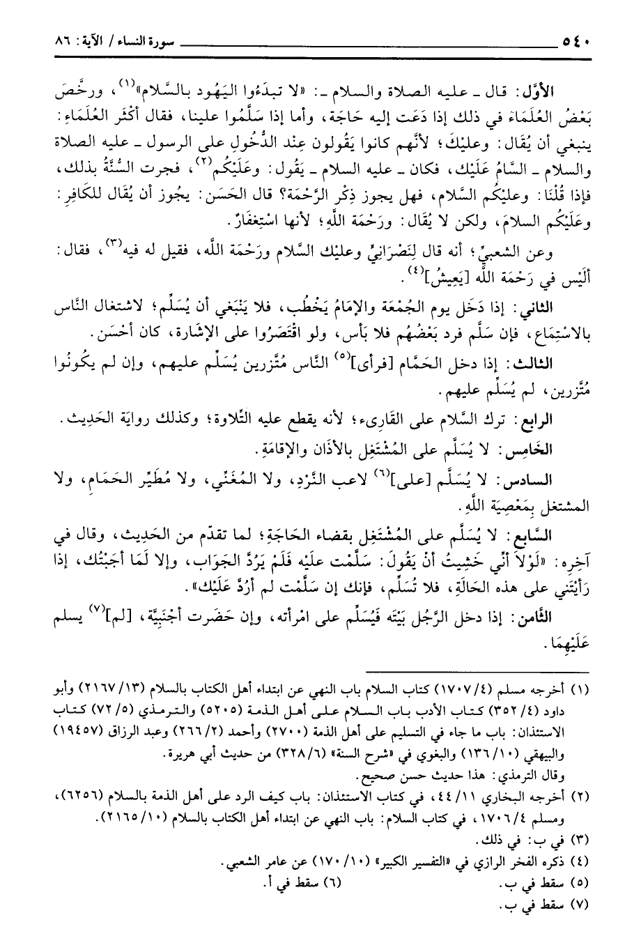 الأوَّل: قال - عَلَيْهِ الصَّلَاة وَالسَّلَام ُ -:» لا تبدَءُوا اليَهُود بالسَّلام «، ورخَّصَ بَعْضَ العُلَمَاءِ في ذلك إذا دَعَت إليه حَاجَة، وأما إذا سَلَّمُوا علينا، فقال أكْثَر العُلَمَاءِ: ينبغي أن يُقَال: وعليْكَ؛ لأنَّهم كانوا يَقُولون عِنْد الدُّخُولِ على الرسول - عَلَيْهِ الصَّلَاة وَالسَّلَام ُ - السَّامُ عَلَيْك، فكان - عليه السلام - يَقُول: وعَلَيْكُم، فجرت السُّنَّةُ بذلك، فإذا قُلْنَا: وعليْكُم السَّلام، فهل يجوز ذِكْر الرَّحْمَة؟ قال الحَسَن: يجُوز أن يُقال للكافِرِ: وعَلَيْكُم السلامَ، ولكن لا يُقَال: ورَحْمَة اللهِ؛ لأنها اسْتِغْفَارٌ.