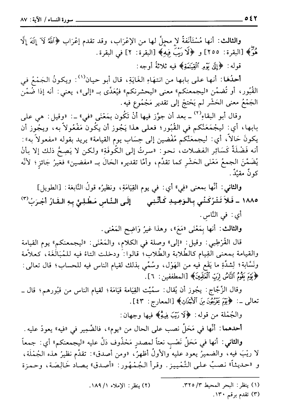 وقال أبو البقاءِ - بعد أن جوَّز فيها أن تكون بمَعْنَى «في» -: «وقيل: هي على بابها، أي: ليجمعَنَّكم في القُبُور؛ فعلى هذا يَجُوز أن يكُون مَفْعُولاً به، ويجُوز أن يكون حَالاً، أي: ليجمَعَنَّكم مُفْضين إلى حِسَاب يوم القيامة» يريد بقوله «مفعولاً به» : أنه فَضْلَةٌ كَسَائِر الفضلات، نحو: «سرتُ إلى الكُوفَةِ» ولكن لا يَصِحُّ ذلك إلا بأنْ يُضَمَّنَ الجمعُ مَعْنَى الحَشْرِ كما تقدَّم، وأمَّا تقديره الحَالَ ب «مفضين» فغيرُ جَائزٍ؛ لأنَّه كونٌ مقيَّدٌ.