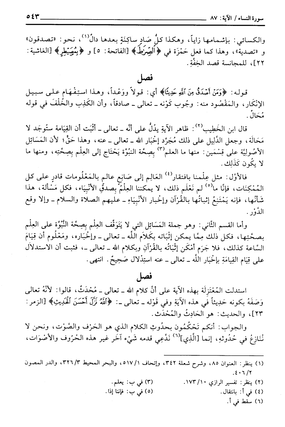 والجواب: أنكم تَحْكُمُون بحدُوثِ الكلام الذي هو الحَرْف والصَّوْت، ونحن لا نُنَازعُ في حُدُوثِهِ، إنما [الَّذِي] نَدَّعِي قدمه شَيْء آخَر غير هذه الحُرُوف والأصْوَات،