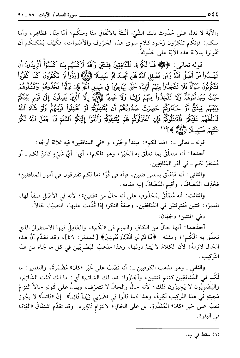 والثاني - وهو مذهب الكوفيين -: أنه نَصْبٌ على خَبَر «كان» مُضْمَرةً، والتقدير: ما لَكُم في المُنَافِقِين كنتم فئتين، وأجَازوا: «ما لك الشاتم» أي: ما لك كُنْتَ الشَّاتِمَ، والبَصْرِيُّون لا يُجِيزُون ذلك؛ لأنه حالٌ والحالُ لا تتعرَّف، ويدلُّ على كَوْنِهِ حالاً التزامُ مَجِيئه في هذا التَّركِيب نَكِرةً، وهذا كما قالُوا في «ضَرْبِي زَيْداً قَائِماً» : إنَّ «قائماً» لا يجُوز نصبُه على خَبَر «كان» المُقَدَّرةِ، بل على الحَالِ؛ لالتزامِ تَنْكيره. وقد تقدَّم اشتِقَاقُ «الفِئَة» في البقرة.