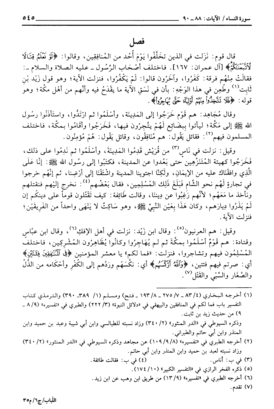قال قوم: نَزَلت في الذين تخَلَّفُوا يَوْمَ أحُد من المُنَافِقِين، وقالوا: {لَوْ نَعْلَمُ قِتَالاً لاَّتَّبَعْنَاكُمْ} [آل عمران: 167] . فاختلف أصْحَاب الرَّسُول - عَلَيْهِ الصَّلَاة وَالسَّلَام ُ -: فقالَتْ مَنْهُم فرقة: كَفَرُوا، وآخَرُون قالوا: لَمْ يَكْفُرُوا، فنزلت الآية؛ وهو قول زَيْد بْنِ ثَابِت وطُعِن في هذا الوَجْهِ: بأن في نَسَقِ الآية ما يَقْدَحُ فيه وأنَّهم من أهْل مكَّة؛ وهو قوله: {فَلاَ تَتَّخِذُواْ مِنْهُمْ أَوْلِيَآءَ حتى يُهَاجِرُواْ} .