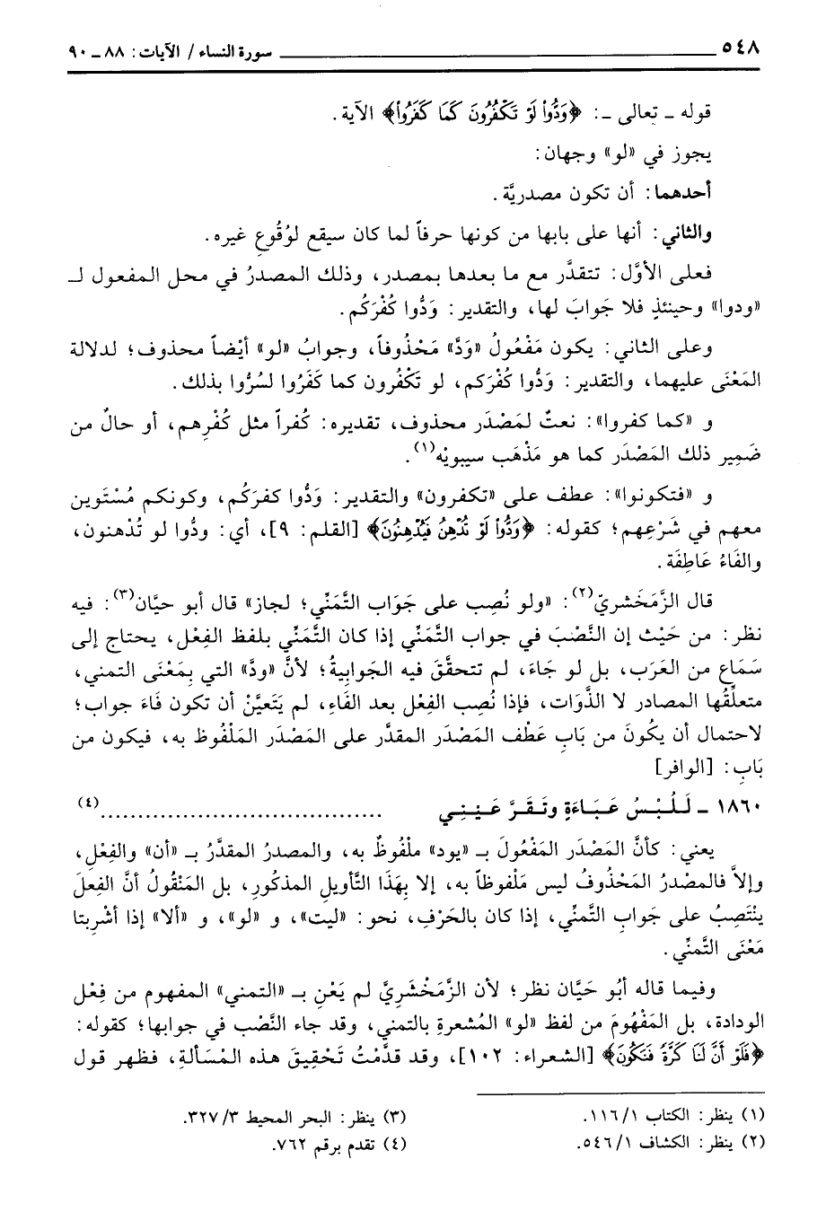 وعلى الثاني: يكون مَفْعُولُ» وَدَّ «مَحْذُوفاً، وجوابُ» لو «أيْضاً محذوف؛ لدلالة المَعْنَى عليهما، والتقدير: وَدُّوا كُفْرَكم، لو تَكْفُرون كما كَفَرُوا لسُرُّوا بذلك.