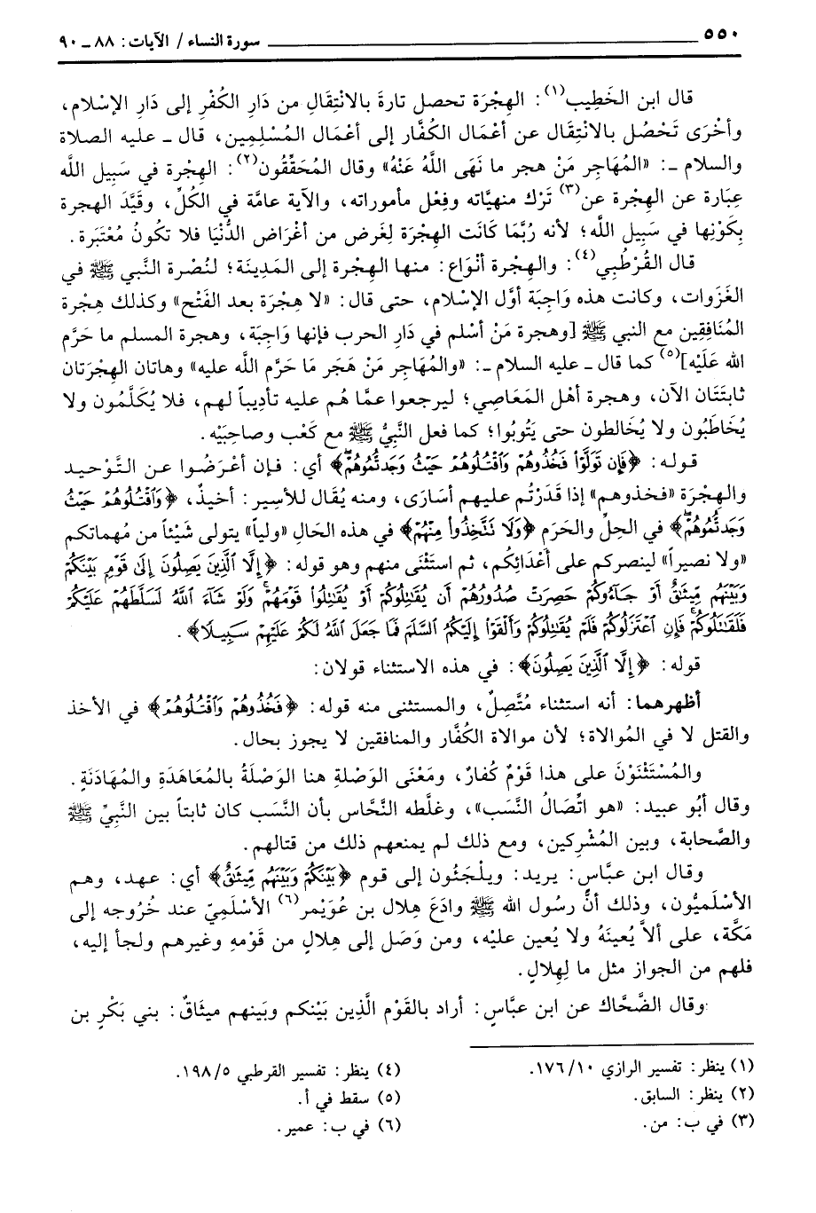 والمُسْتَثْنَوْنَ على هذا قَوْمٌ كُفارٌ، ومَعْنَى الوَصْلَةِ هنا الوَصْلَةُ بالمُعَاهَدَةِ والمُهَادَنَةِ. وقال أبُو عبيد: «هو اتِّصَالُ النَّسَب» ، وغلَّطه النَّحَّاس بأن النَّسَب كان ثابتاً بين النَّبِيِّ صَلَّى اللَّهُ عَلَيْهِ وَسَلَّم َ والصَّحابة، وبين المُشْرِكين، ومع ذلك لم يمنعهم ذلك من قتالهم.