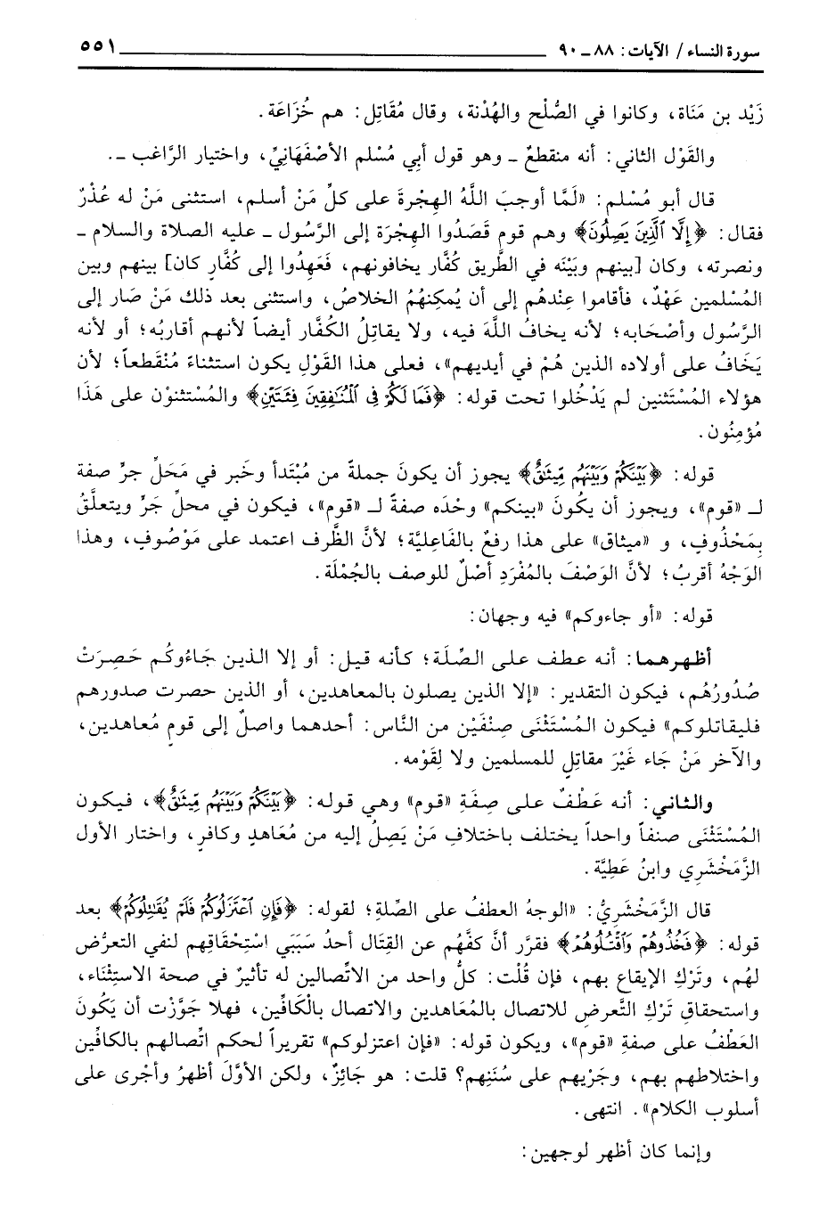 والثاني: أنه عضطْفٌ على صِفَةِ «قوم» وهي قوله: {فَإِنِ اعتزلوكم فَلَمْ يُقَاتِلُوكُمْ} بعد قوله: {فَخُذُوهُمْ واقتلوهم} فقرَّر أنَّ كفَّهُم عن القِتَال أحدُ سَبَبَي اسْتِحقَاقِهم لنفي التعرُّض لهُم، وتَرْكِ الإيقاع بهم، فإن قُلْت: كلُّ واحد من الاتِّصالين له تأثيرٌ في صحة الاستِثْنَاء، واستحقاقِ تَرْكِ التَّعرضِ للاتصال بالمُعَاهدين والاتصال بالْكَافِّين، فهلا جَوَّزْت أن يَكُونَ العَطْفُ على صفةِ «قوم» ، ويكون قوله: «فإن اعتزلوكم» تقريراً لحكم اتِّصالهم بالكافِّين واختلاطهم بهم، وجَرْيهم على سُنَنِهم؟ قلت: هو جَائِزٌ، ولكن الأوَّلَ أظهرُ وأجْرى على أٍلوب الكلام «. انتهى.