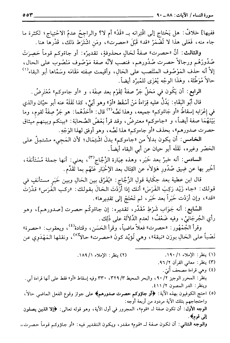 قال أبُو البَقَاءِ: يَدُلُّ عليه قِرَاءةُ مَنْ أسْقَط» أو «وهو أبَيٌّ، كذا نَقَلَهُ عنه أبو حيَّان والذي في إعْرَابِه إسقاطُ» أو جاءُوكم «جميعه، وهذا نَصُّه قال:» أحَدُهُما: هو جَرٌّ صِفَةً لقومِ، وما بَيْنَهُمَا صفة أيضاً، و «جاءوكم» هذا نَصُّه، وهو أوفق لهذا الوَجْهِ.