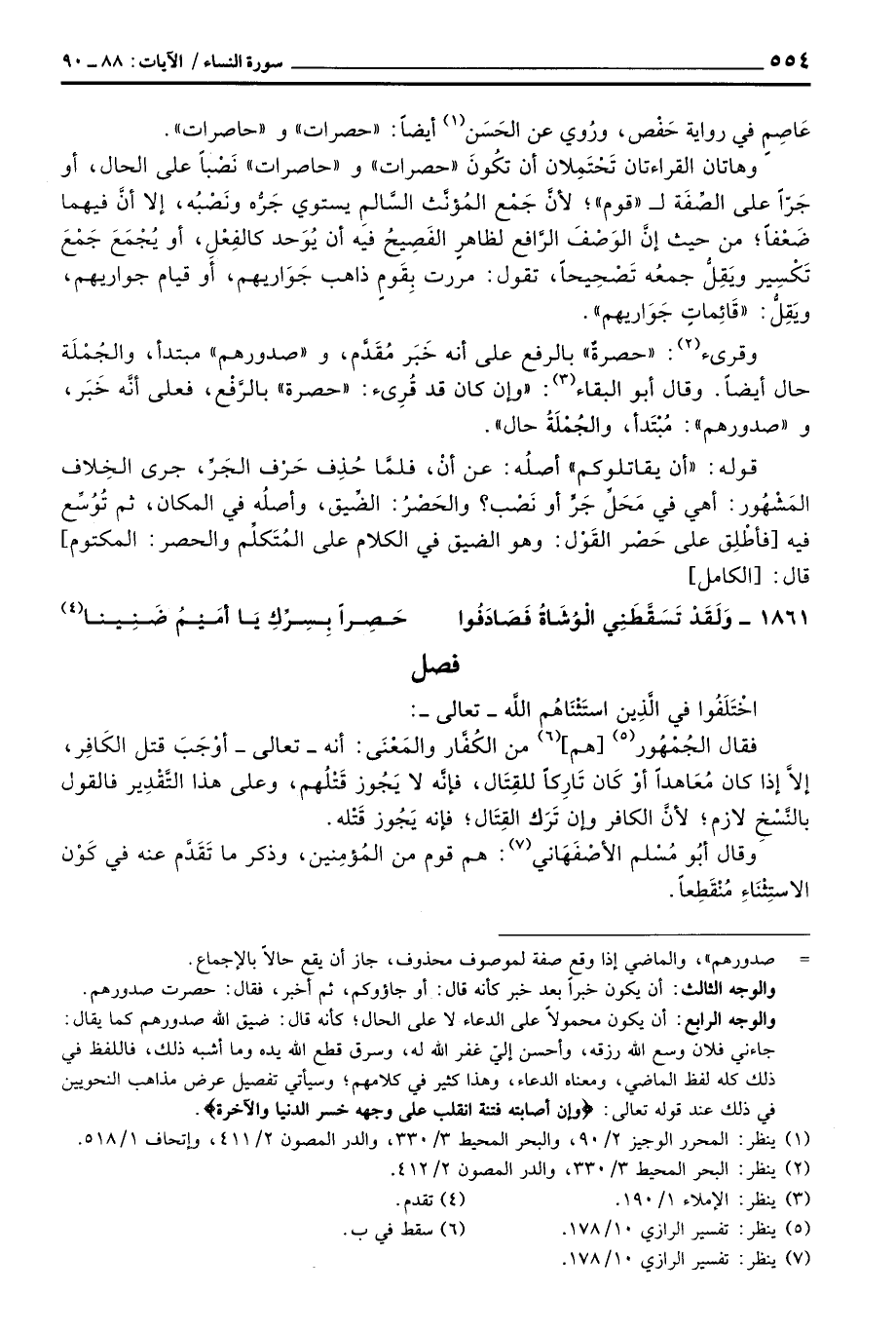 قوله: «أن يقاتلوكم» أصلُه: عن أنْ: فلمَّا حُذِف حَرْف الجَرِّ، جرى الخِلاف المَشْهُور، أهي في مَحَلِّ جَرٍّ أو نَصْب؟ والحَصْرُ: الضِّيق، وأصلُه في المكان، ثم تُوُسِّع فيه [فأطْلِق على حَصْر القَوْل: وهو الضيق في الكلام على المُتَكلِّم والحصر: المكتوم] قال: [الكامل]