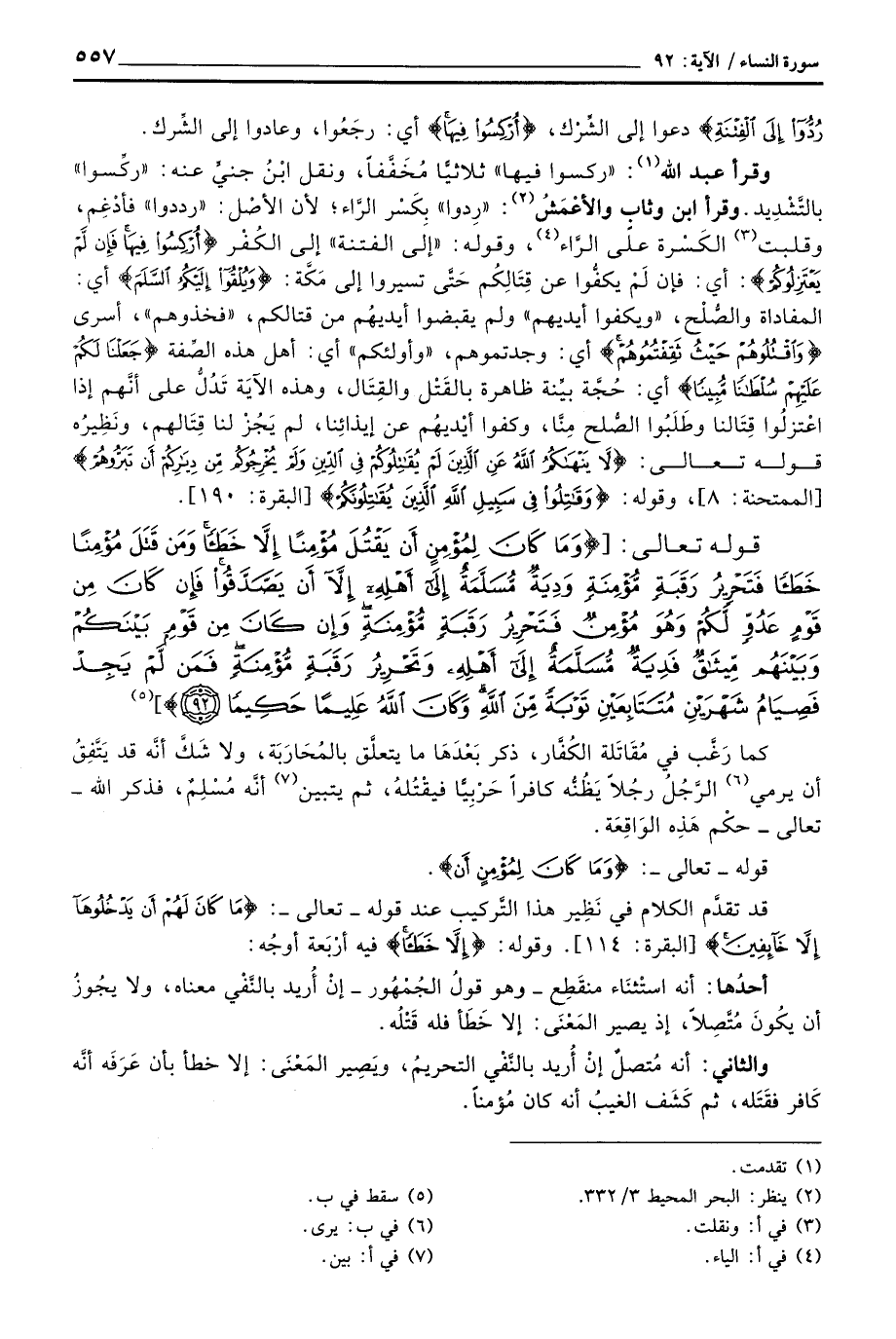 وقرأ عبد الله: «ركسوا فيها» ثلاثيَّا مُخَفَّفاً، ونقل ابْنُ جنيٍّ عنه: «ركَّسوا» بالتَّشْديد. وقرأ ابن وثابِ والأعْمِشُ: «رِدوا» بِكَسْر الرَّاء؛ لأن الأصْل: «رددوا» فأدْغِم، وقلبت الكَسْرة على الرَّاء. وقوله: «إلى الفتنة» إلى الكُفْر {أُرْكِسُواْ فِيِهَا فَإِن لَّمْ يَعْتَزِلُوكُمْ} أي: فإن لَمْ يكفُّوا عن قِتَالِكُم حَتَّى تسيروا إلى مَكَّة: {ويلقوا إِلَيْكُمُ السلم} أي: المفاداة والصُّلْح، «ويكفوا أيديهم» ولم يقبضوا أيديهُم من قتالكم، «فخذوهم» ، أسرى {واقتلوهم حَيْثُ ثِقِفْتُمُوهُمْ} أي: وجدتموهم، «وأولئكم» أي: أهل هذه الصِّفة {جَعَلْنَا لَكُمْ عَلَيْهِمْ سُلْطَاناً مُّبِيناً} أي: حُجَّة بيِّنة ظاهرة بالقَتلِْ والقِتَال، وهذه الآيَة تَدُلُّ على أنَّهُم إذا اعْتزلوا قِتَالَنا وطَلَبُوا الصُّلحِ مَنَّا، وكفوا أيْديهُم عن إيذائِنا، لم يَجُزْ لنا قِتَالهم، ونَظِيرُه قوله تعالى: {لاَّ يَنْهَاكُمُ الله عَنِ الذين لَمْ يُقَاتِلُوكُمْ فِي الدين وَلَمْ يُخْرِجُوكُمْ مِّن دِيَارِكُمْ أَن تَبَرُّوهُمْ} [الممتحنة: 8] ، وقوله: {وَقَاتِلُواْ فِي سَبِيلِ الله الذين يُقَاتِلُونَكُمْ} [البقرة: 190] .