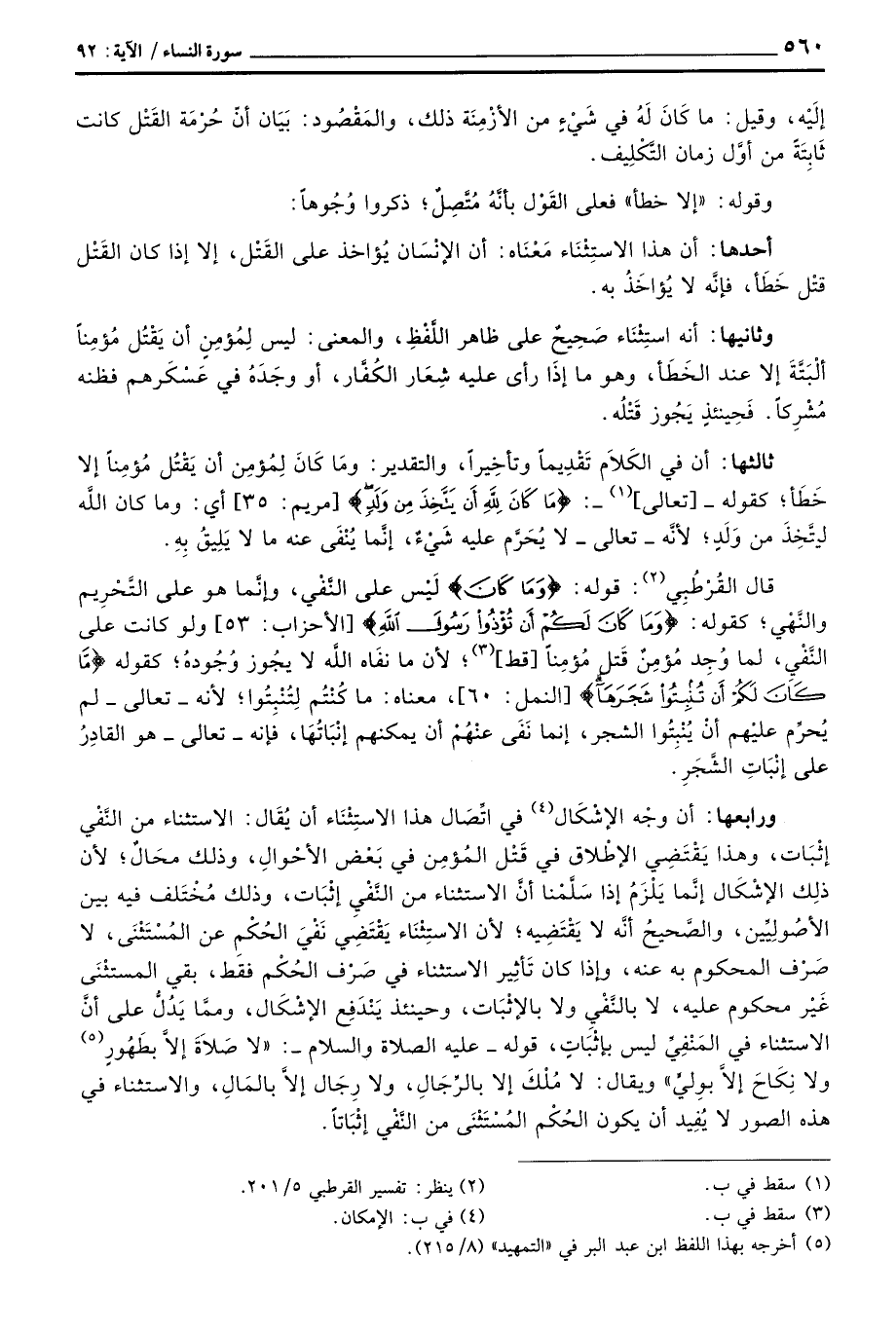 وثانيها: أنه استْثْنَاء صَحِيحٌ على ظاهر اللِّفْظِ، والمعنى: ليس لِمُؤمِنٍ أن يَقْتُل مُؤمِناً ألْبَتَّةَ إلا عند الخَطَأ، وهو ما إذا رأى عليه شِعَار الكُفَّار، أو وَجَدهُ في عَسْكَرِهِم فظنه مُشْرِكاً.