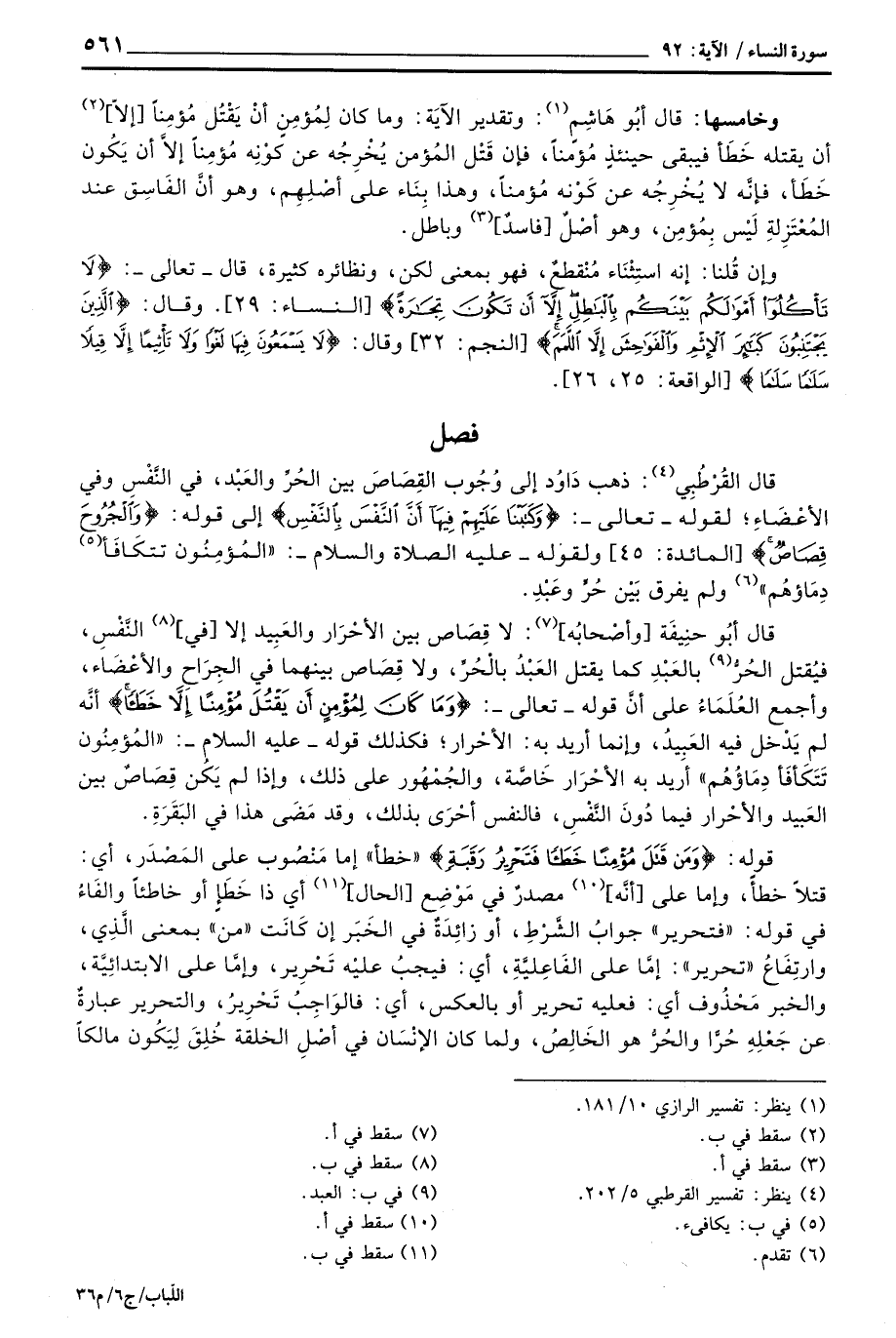 قوله: {وَمَن قَتَلَ مُؤْمِناً خَطَئاً فَتَحْرِيرُ رَقَبَةٍ} «خطأ» إما مَنْصُوب على المَصْدَر، أي: قتلاً خطأ، وإما على [أنَّه] مصدرٌ في مَوْضِع [الحال] أي ذا خَطَأٍ أو خاطئاً والفَاء في قوله: «فتحرير» جوابُ الشَّرْطِ، أو زائِدَةٌ في الخَبَر إن كَانَت «من» بمعنى الَّذِي، وارتِفَاعُ «تحرير» : إمَّا على الفَاعِليَّةِ، أي: فيجبُ عليْه تَحْرِير، وإمَّا على الابتدائِيَّة، والخبر مَحْذُوف أي: فعليه تحرير أو بالعكس، أي: فالوَاجِبُ تَحْرِيرُ، والتحرير عبارةٌ عن جَعْلِهِ حُرَّا والحُرُّ هو الخَالِصُ، ولما كان الإنْسَان في أصْلِ الخلقة خُلِقَ لِيَكُون مالكاً