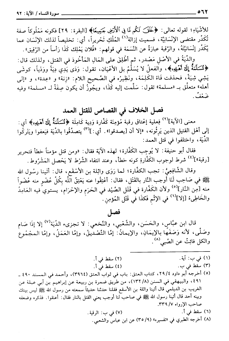 معنى [الآية] فِعلية رقبة مُؤمِنَة كَفَّارة وَدِية كَامِلَة {مُّسَلَّمَةٌ إلى أَهْلِهِ} أي: إلأى أهْل القتيل الذين يَرِثُونه، «إلا أن [يصدقوا» . أي:] يتصدَّقُوا بالدِّيَة فيَعفوا ويَتْرُكُوا الدِّيَة، واختلفوا في قتل العمد: