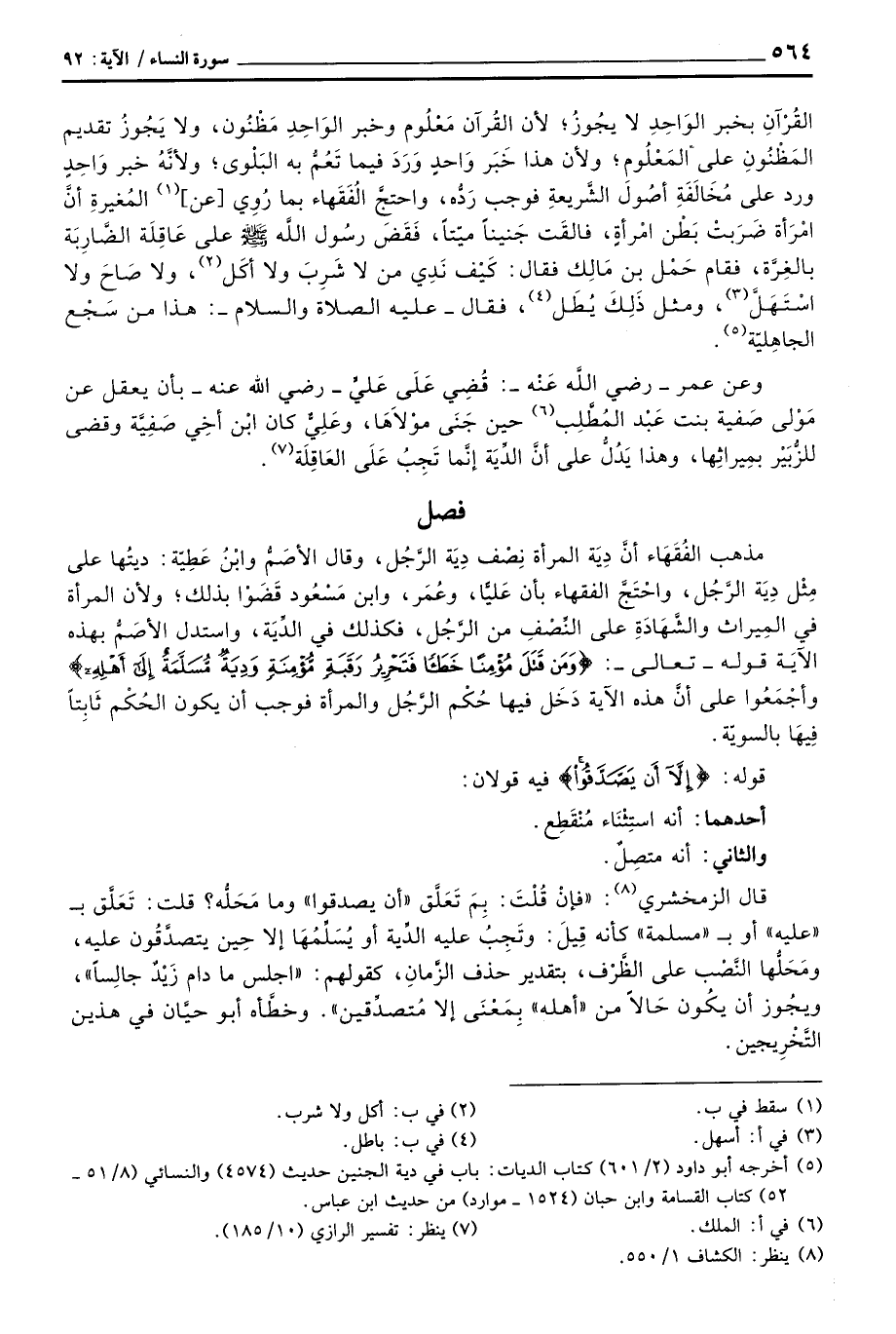 مذهب الفُقَهَاء أنَّ دِيَة المرأة نِصْف دِيَة الرَّجُل، وقال الأصَمُّ وابن عَطِيّة: ديتُها مِثْلُ دِيَةِ الرَّجُل، واحْتَجَّ الفقهاء بأن عَليَّا، وعُمَر، وابن مَسْعُود قَضَوْا بذلك؛ ولأن المرأة في المِيراث والشَّهَادَةِ على النِّصْفِ من الرَّجُلِ، فكذلك في الدِّيَة، واستدل الأصَمُّ بهذه الآيَة قوله - تعالى -: {وَمَن قَتَلَ مُؤْمِناً خَطَئاً فَتَحْرِيرُ رَقَبَةٍ مُّؤْمِنَةٍ وَدِيَةٌ مُّسَلَّمَةٌ إلى أَهْلِهِ} وأجْمَعُوا على أنَّ هذه الآية دَخَلَ فيها حُكْم الرَّجُل والمرأة فوجب أن يكون الحُكْم ثَابِتاً فِيَها بالسويّة.