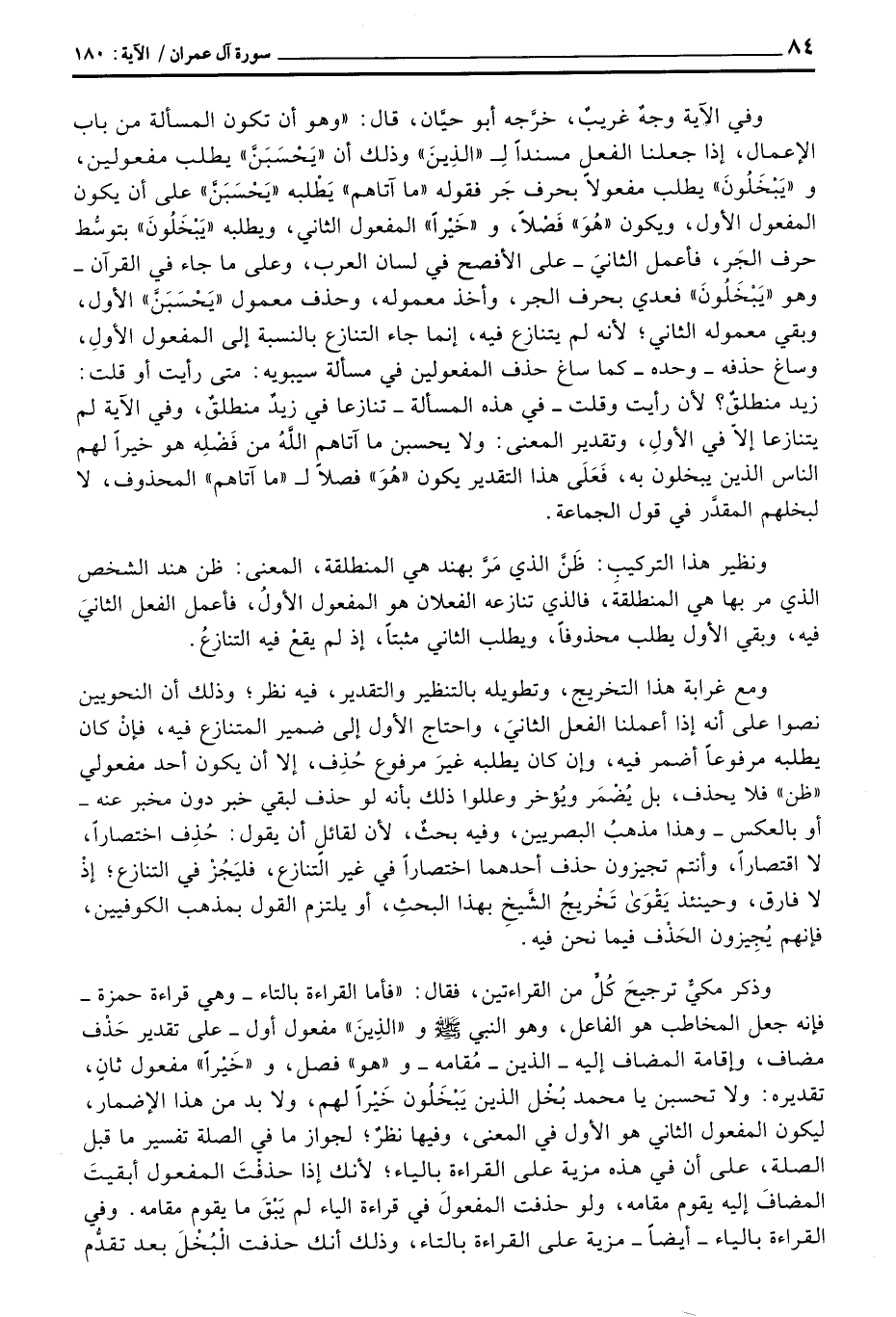 وفي الآية وجهٌ غريبٌ، خرَّجه أبو حيَّان، قال: «وهو أن تكون المسألة من باب الإعمال، إذا جعلنا الفعل مسنداً لِ» الذِينَ «وذلك أن» يَحْسَبْنَّ «يطلب مفعولين، و» يَبْخَلُونَ «يطلب مفعولاً بحرف جَر فقوله» ما أتاهم «يَطْلبه» يَحْسَبَنَّ «على أن يكون المفعول الأول، ويكون» هُوَ «فَصْلاً، و» خَيْراً «المفعول الثاني، ويطلبه» يَبْخَلونَ «بتوسُّط حرف الجَر، فأعمل الثانيَ - على الفصح في لسان العرب، وعلى ما جاء في القرآن - وهو» يَبْخَلونَ «فعدي بحرف الجر، وأخذ معمواه، وحذف معمول» يَحْسَبَنَّ «الأول، وبقي معموله الثاني؛ لأنه لم يتنازع فيه، إنما جاء التنازع بالنسبة إلى المفعول الأولِ، وساغ حذفه - وحده - كما ساغ حذف المفعولين في مسألة سيبويه: متى رأيت أو قلت: زيد منطلقٌ؟ لأن رأيت وقلت - في هذه المسألة - تنازعا في زيدٌ منطلقٌ، وفي الآية لم يتنازعا إلاَ في الأولِ، وتقدير المعنى: ولا يحسبن ما آتاهم اللهُ من فَضْلِه هو خيراً لهم الناس الذين يبخلون به، فَعَلَى هذا التقدير يكون» هُوَ «فصلاً ل» ما آتاهم «المحذوف، لا لبخلهم المقدَّر في قول الجماعة.