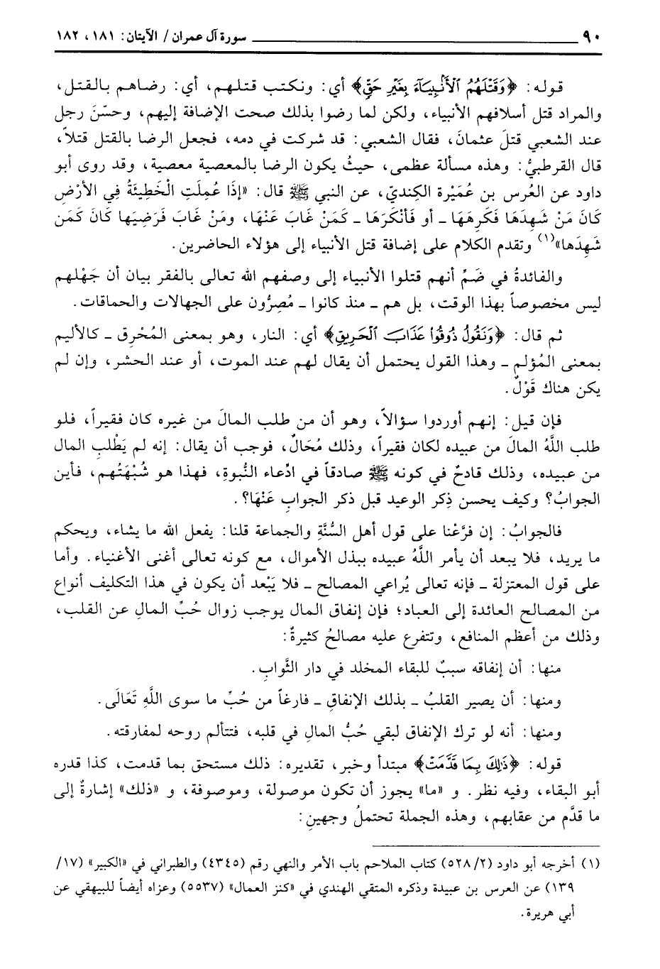 قوله: {وَقَتْلَهُمُ الأَنبِيَاءَ بِغَيْرِ حَقٍّ} أي: ونكتب قتلهم، أي: رضاهم بالقتل، والمراد قتل أسلافهم الأنبياء، ولكن لما رضوا بذلك صحت الإضافة إليهم، حسّنَ رجل عند الشعبي قتلَ عثمانَ، فقال الشعبي: قد شركت في دمه، فجعل الرضا بالقتل قتلاً، قال القرطبيُّ: وهذه مسألة عظمى، حيثُ يكون الرضا بالمعصية معصية، وقد روى أبو داود عن العُرس بن عُمَيْرة الكِنديّ، عن النبي صَلَّى اللَّهُ عَلَيْهِ وَسَلَّم َ قال: